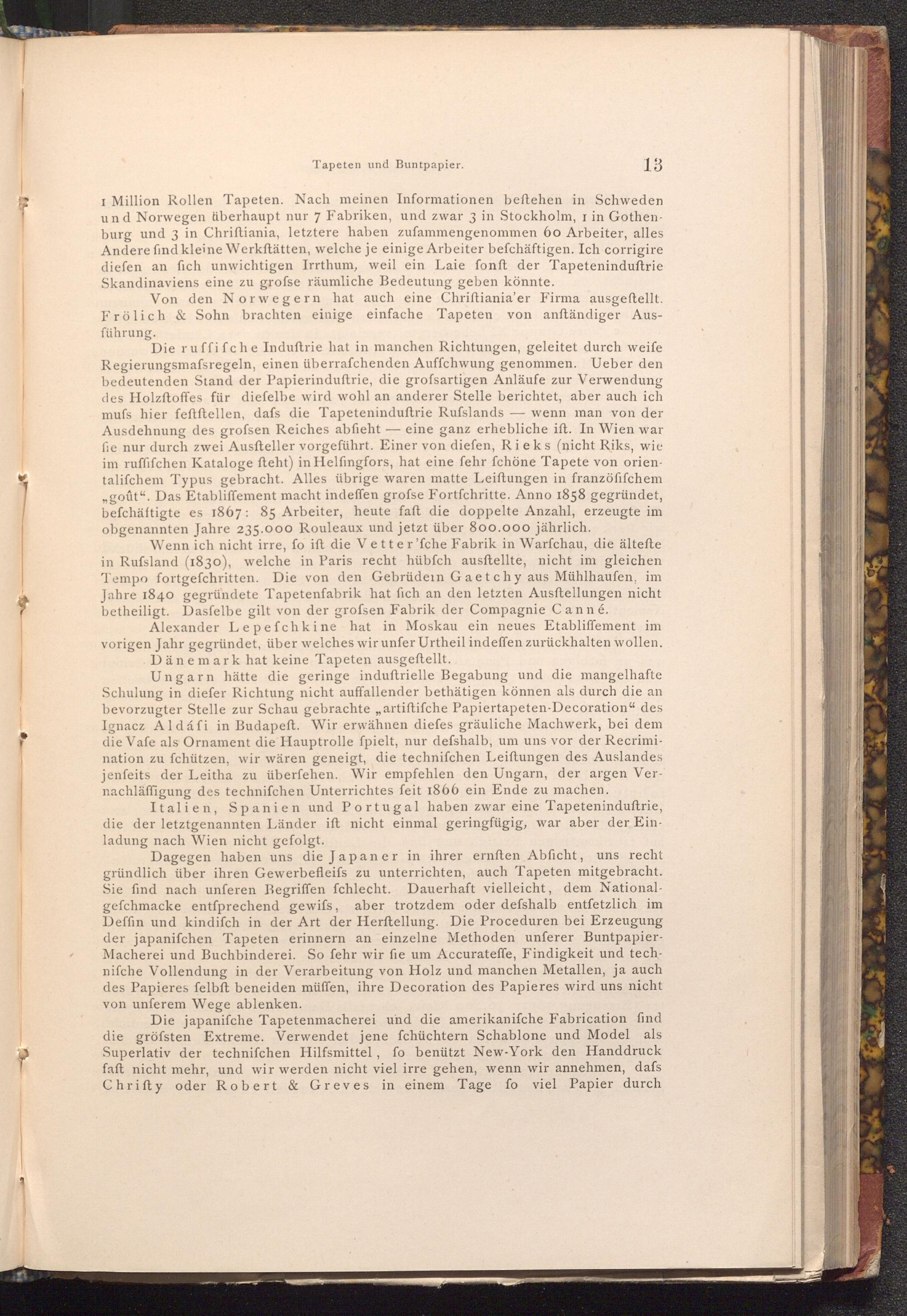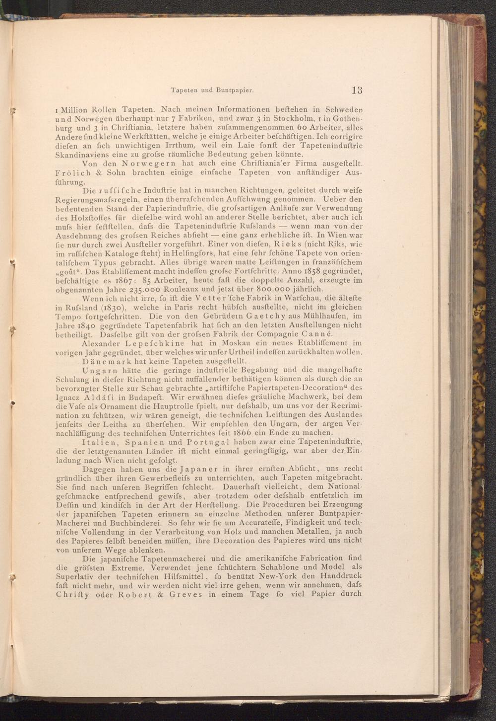Wenn ich nicht irre, fo ift die Vetter'fche Fabrik in Warfchau, die ältefte in Rufsland( 1830), welche in Paris recht hübfch ausftellte, nicht im gleichen Tempo fortgefchritten. Die von den Gebrüdein Gaetchy aus Mühlhaufen, im Jahre 1840 gegründete Tapetenfabrik hat fich an den letzten Ausftellungen nicht betheiligt. Dasfelbe gilt von der grofsen Fabrik der Compagnie Canné.