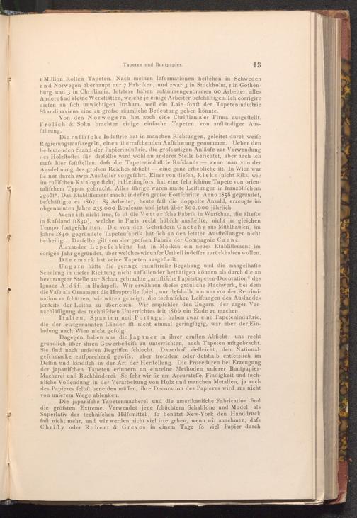 Die ruffifche Induftrie hat in manchen Richtungen, geleitet durch weife Regierungsmafsregeln, einen überrafchenden Auffchwung genommen. Ueber den bedeutenden Stand der Papierinduftrie, die grofsartigen Anläufe zur Verwendung des Holzftoffes für diefelbe wird wohl an anderer Stelle berichtet, aber auch ich mufs hier feftftellen, dafs die Tapeteninduftrie Rufslands wenn man von der Ausdehnung des grofsen Reiches abfieht eine ganz erhebliche ift. In Wien war fie nur durch zwei Ausfteller vorgeführt. Einer von diefen, Rieks( nicht Riks, wie im ruffifchen Kataloge fteht) in Helfingfors, hat eine fehr fchöne Tapete von orien talifchem Typus gebracht. Alles übrige waren matte Leiftungen in franzöfifchem " goût". Das Etabliffement macht indeffen grofse Fortfchritte. Anno 1858 gegründet, befchäftigte es 1867: 85 Arbeiter, heute faft die doppelte Anzahl, erzeugte im obgenannten Jahre 235.000 Rouleaux und jetzt über 800.000 jährlich.