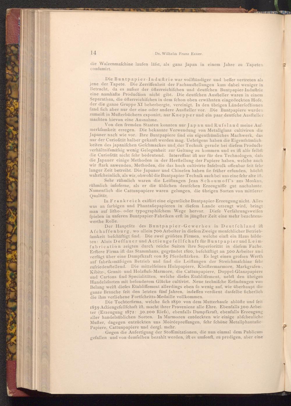 Die Buntpapier Induftrie war vollſtändiger und beffer vertreten als jene der Tapete. Die Zerriffenheit der Fachausstellungen kam dabei weniger in Betracht, da es aufser der öfterreichifchen und deutfchen Buntpapier- Induftrie eine namhafte Production nicht gibt. Die deutfchen Ausfteller waren in einem Separatbau, die öfterreichifchen in dem fchon oben erwähnten eingedeckten Hofe, der die ganze Gruppe XI beherbergte, vereinigt. In den übrigen Länderfectionen fand fich aber nur der eine oder andere Ausfteller vor. Die Buntpapiere wurden zumeift in Mufterbüchern exponirt, nur Knepper und ein paar deutfche Ausfteller machten hievon eine Ausnahme.