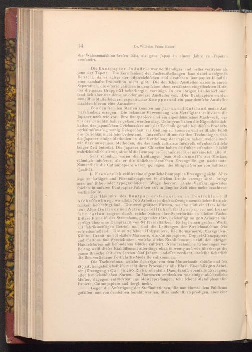 Von den fremden Staaten konnten nur Japan und Rufsland meine Aufmerkfamkeit erregen. Die bekannte Verwendung von Metallglanz cultiviren die Japaner nach wie vor. Ihre Buntpapiere find ein eigenthümliches Machwerk, das nur der Curiofität halber gekauft werden mag. Uebrigens haben die Eigenthümlichkeiten des japanifchen Gefchmackes und der Technik gerade bei diefem Producte verhältnifsmäfsig wenig Gelegenheit zur Geltung zu kommen und es ift alfo felbft die Curiofität nicht fehr bedeutend. Intereffant ift nur für den Technologen, dafs die Japaner einige Methoden in der Herftellung der Papiere haben, welche auch wir ftark anwenden, Methoden, die das hoch cultivirte Infelvolk offenbar feit fehr langer Zeit betreibt. Die Japaner und Chinefen haben fie früher erfunden, höchft wahrfcheinlich, als wir, obwohl die Buntpapier- Technik auch bei uns eine fehr alte ift. Sehr rühmlich waren die Leiftungen Jean Schoumoff's aus Moskau, rühmlich infoferne, als er die üblichen deutfchen Erzeugniffe gut nachahmte. Namentlich die Cattunpapiere waren gelungen, die übrigen Sorten von mittlerer Qualität.
