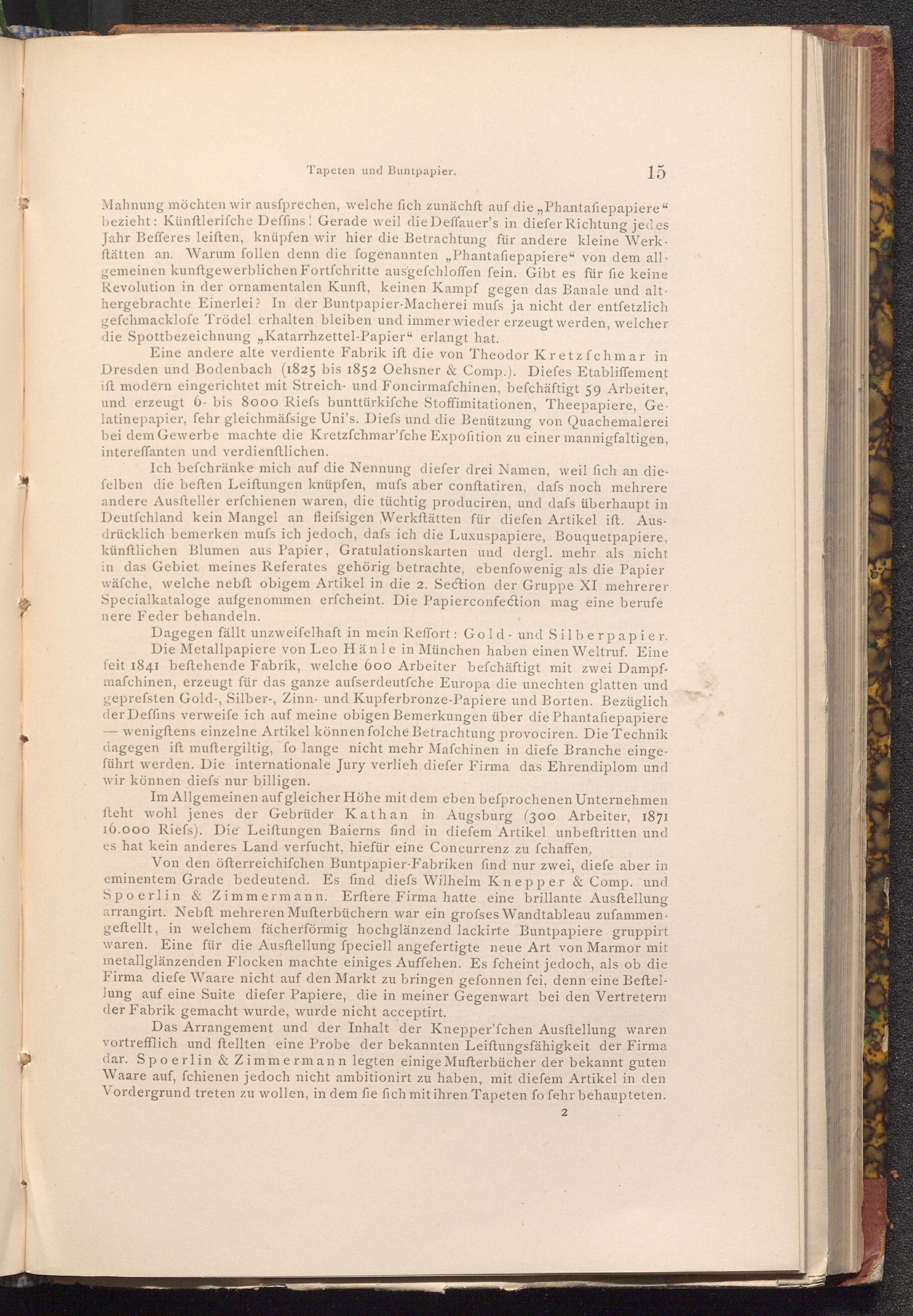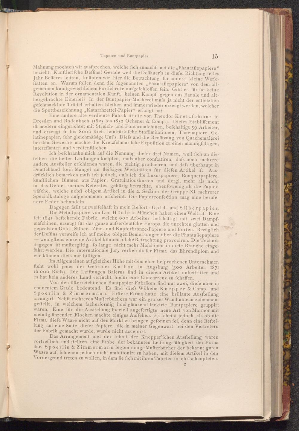 Ich befchränke mich auf die Nennung diefer drei Namen, weil fich an diefelben die beften Leiftungen knüpfen, mufs aber conftatiren, dafs noch mehrere andere Ausfteller erfchienen waren, die tüchtig produciren, und dafs überhaupt in Deutfchland kein Mangel an fleifsigen Werkstätten für diefen Artikel ift. Ausdrücklich bemerken muss ich jedoch, dafs ich die Luxuspapiere, Bouquetpapiere, künftlichen Blumen aus Papier, Gratulationskarten und dergl. mehr als nicht in das Gebiet meines Referates gehörig betrachte, ebenfowenig als die Papier wäfche, welche nebft obigem Artikel in die 2. Section der Gruppe XI mehrerer Specialkataloge aufgenommen erfcheint. Die Papierconfection mag eine berufe nere Feder behandeln.