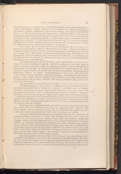 Dagegen fällt unzweifelhaft in mein Reffort: Gold- und Silberpapier. Die Metallpapiere von Leo Hänle in München haben einen Weltruf. Eine feit 1841 beftehende Fabrik, welche 600 Arbeiter befchäftigt mit zwei Dampfmaſchinen, erzeugt für das ganze aufserdeutſche Europa die unechten glatten und geprefsten Gold-, Silber-, Zinn- und Kupferbronze- Papiere und Borten. Bezüglich der Deffins verweife ich auf meine obigen Bemerkungen über die Phantafiepapiere -wenigftens einzelne Artikel können folche Betrachtung provociren. Die Technik dagegen ift muftergiltig, fo lange nicht mehr Maſchinen in diefe Branche eingeführt werden. Die internationale Jury verlieh diefer Firma das Ehrendiplom und wir können diefs nur billigen.