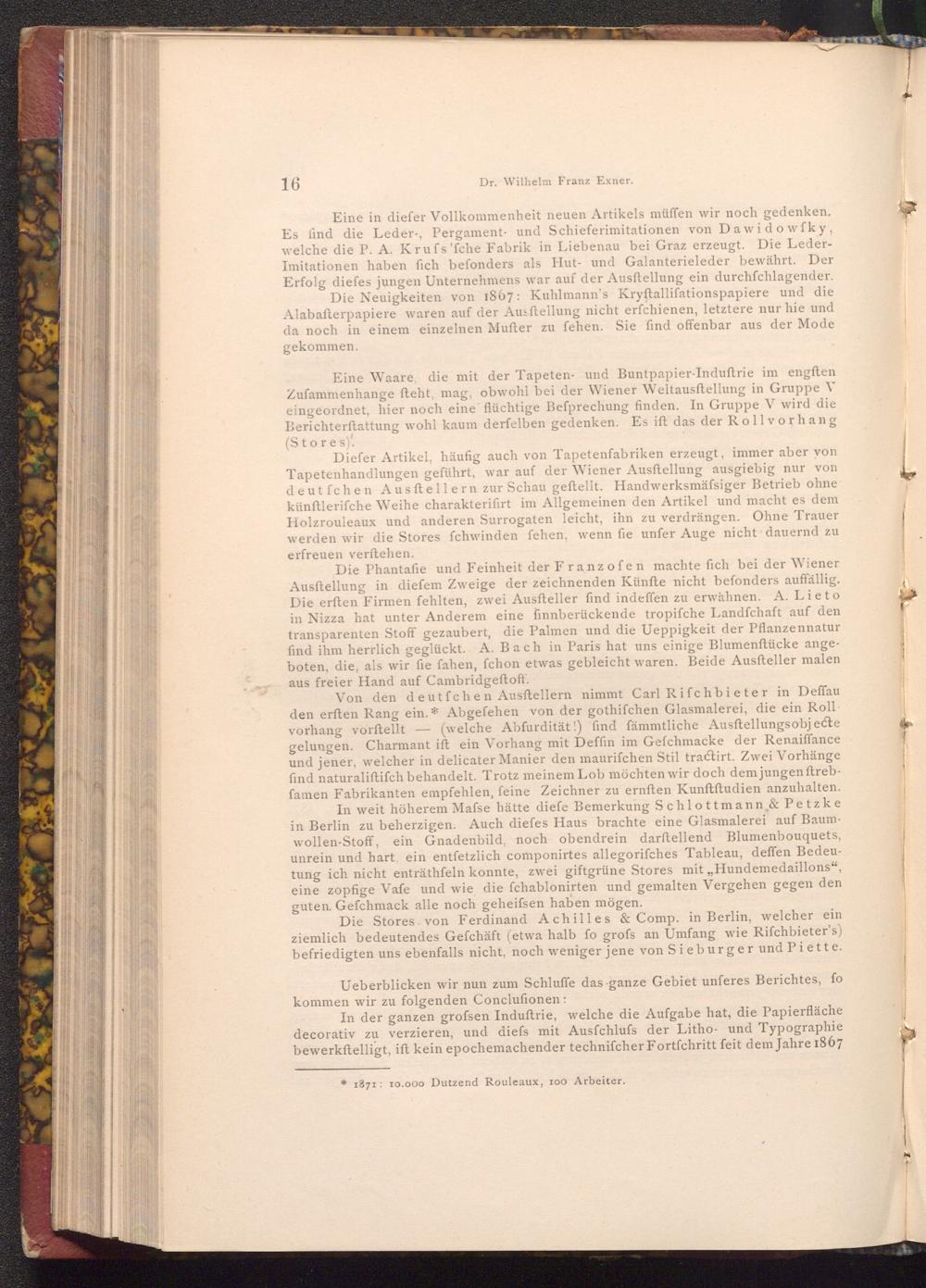 Eine in diefer Vollkommenheit neuen Artikels müffen wir noch gedenken. Es find die Leder, Pergament- und Schieferimitationen von Dawidowfky, welche die P. A. Krufs' fche Fabrik in Liebenau bei Graz erzeugt. Die LederImitationen haben fich befonders als Hut- und Galanterieleder bewährt. Der Erfolg diefes jungen Unternehmens war auf der Ausftellung ein durchfchlagender. Die Neuigkeiten von 1867: Kuhlmann's Kryftallifationspapiere und die Alabafterpapiere waren auf der Ausftellung nicht erfchienen, letztere nur hie und da noch in einem einzelnen Mufter zu fehen. Sie find offenbar aus der Mode gekommen.