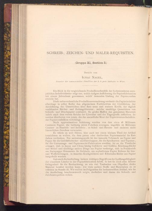 Gab auch die Ausftellung keinen richtigen Begriff von der Leiftungsfähigkeit der einzelnen Länder in der Papierfabrication felbft, fo bot fie doch eine feltene Gelegenheit für die Beobachtung, zu wie viel Taufenden von Objecten diefes Material benützt werden kann; wie viele andere Stoffe und Materialien es zu erfetzen im Stande ift. Wir wollen im Folgenden die bedeutendften Artikel, wie fie die Ausftellung beachtenswerth zeigte, darftellen und daran die Schreib- und Zeichenrequifiten reihen.