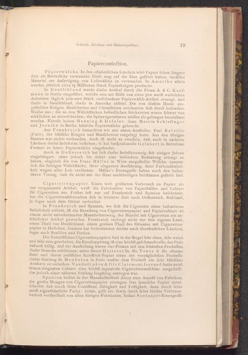 In Deutfchland wurde diefer Artikel durch die Firma A.& C. Kaufmann in Berlin eingeführt, welche nun mit Hilfe von circa 500 meift weiblichen Arbeitern täglich 300.000 Stück verfchiedene Papierwäfch Artikel erzeugt, und theils in Deutfchland, theils in Amerika abfetzt. Die von diefem Haufe ausgeftellten Krägen, Manfchetten und Chemifetten zeichneten fich durch befondere Weifse aus; die an den Wäfchftücken befindlichen Stickereien waren fchwer von wirklichen zu unterfcheiden; die Spitzengarnituren müffen als gelungen bezeichnet werden. Ebenfo haben Henning& Defeler, dann Martin Schlefinger und Jeenike in Berlin hübfche Papierwäfche gebracht.