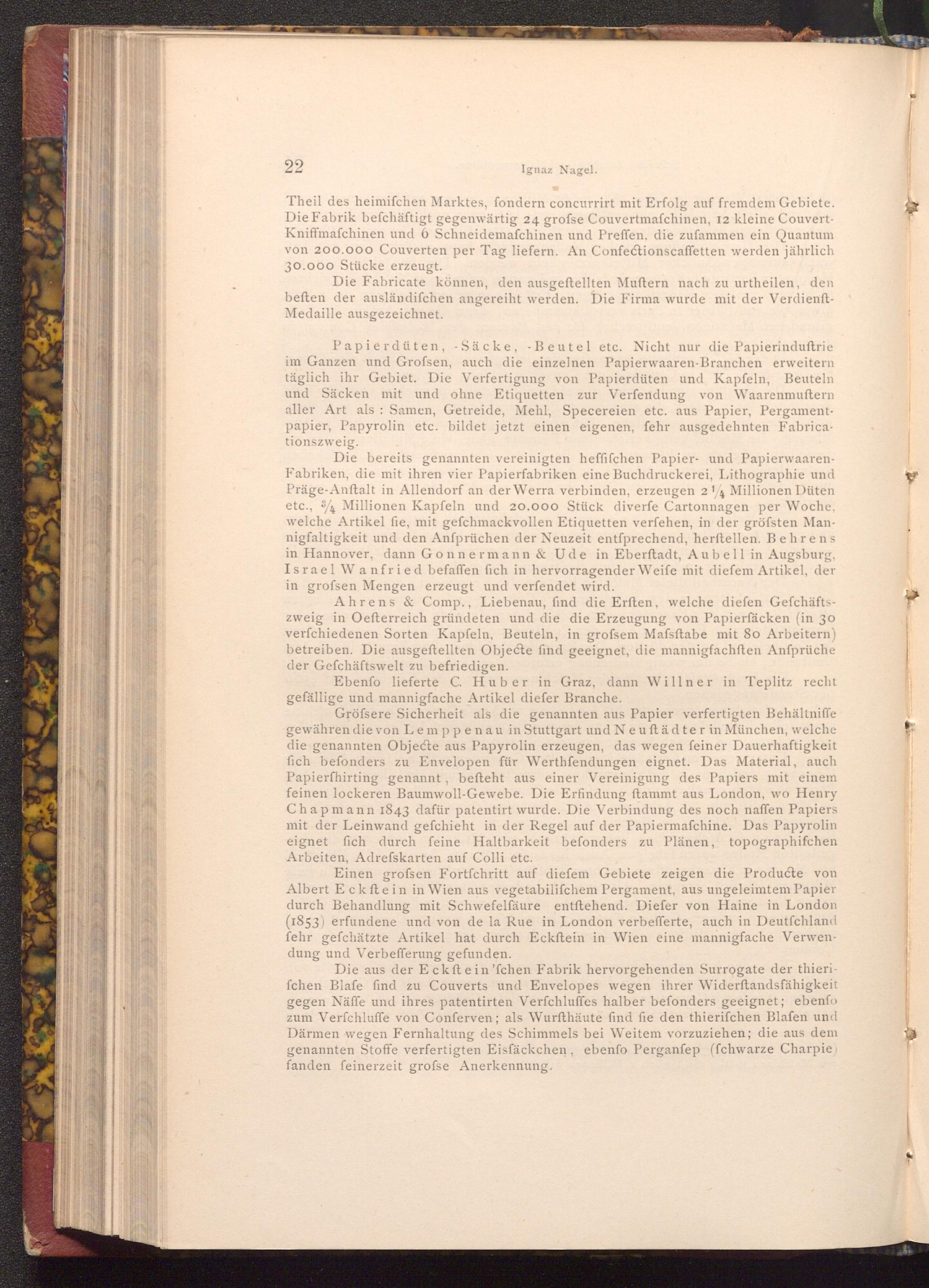 Die bereits genannten vereinigten heffifchen Papier- und PapierwaarenFabriken, die mit ihren vier Papierfabriken eine Buchdruckerei, Lithographie und Präge- Anftalt in Allendorf an der Werra verbinden, erzeugen 214 Millionen Düten etc., 4 Millionen Kapfeln und 20.000 Stück diverfe Cartonnagen per Woche, welche Artikel fie, mit gefchmackvollen Etiquetten verfehen, in der gröfsten Mannigfaltigkeit und den Anfprüchen der Neuzeit entfprechend, herftellen. Behrens in Hannover, dann Gonnermann& Ude in Eberftadt, Aubell in Augsburg, Israel Wanfried befaffen fich in hervorragender Weife mit diefem Artikel, der in grofsen Mengen erzeugt und verfendet wird.