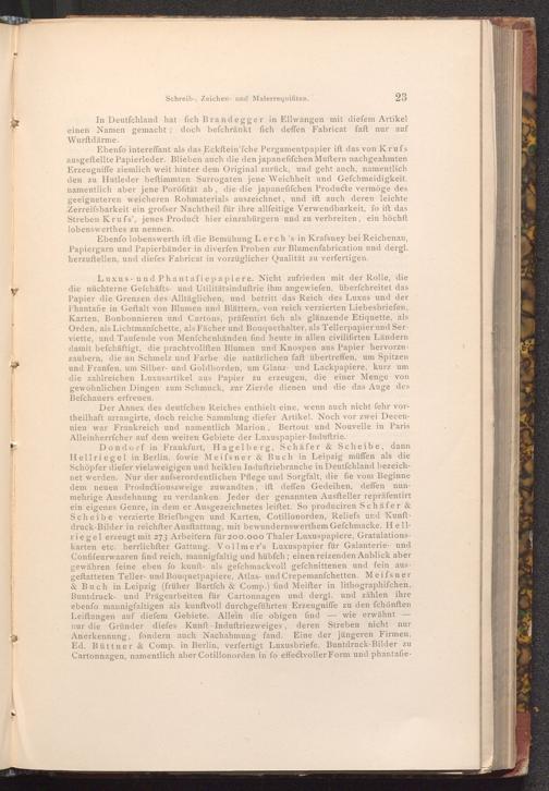 Der Annex des deutfchen Reiches enthielt eine, wenn auch nicht fehr vortheilhaft arrangirte, doch reiche Sammlung diefer Artikel. Noch vor zwei Decennien war Frankreich und namentlich Marion, Bertout und Nouvelle in Paris Alleinherrfcher auf dem weiten Gebiete der Luxuspapier- Induftrie.