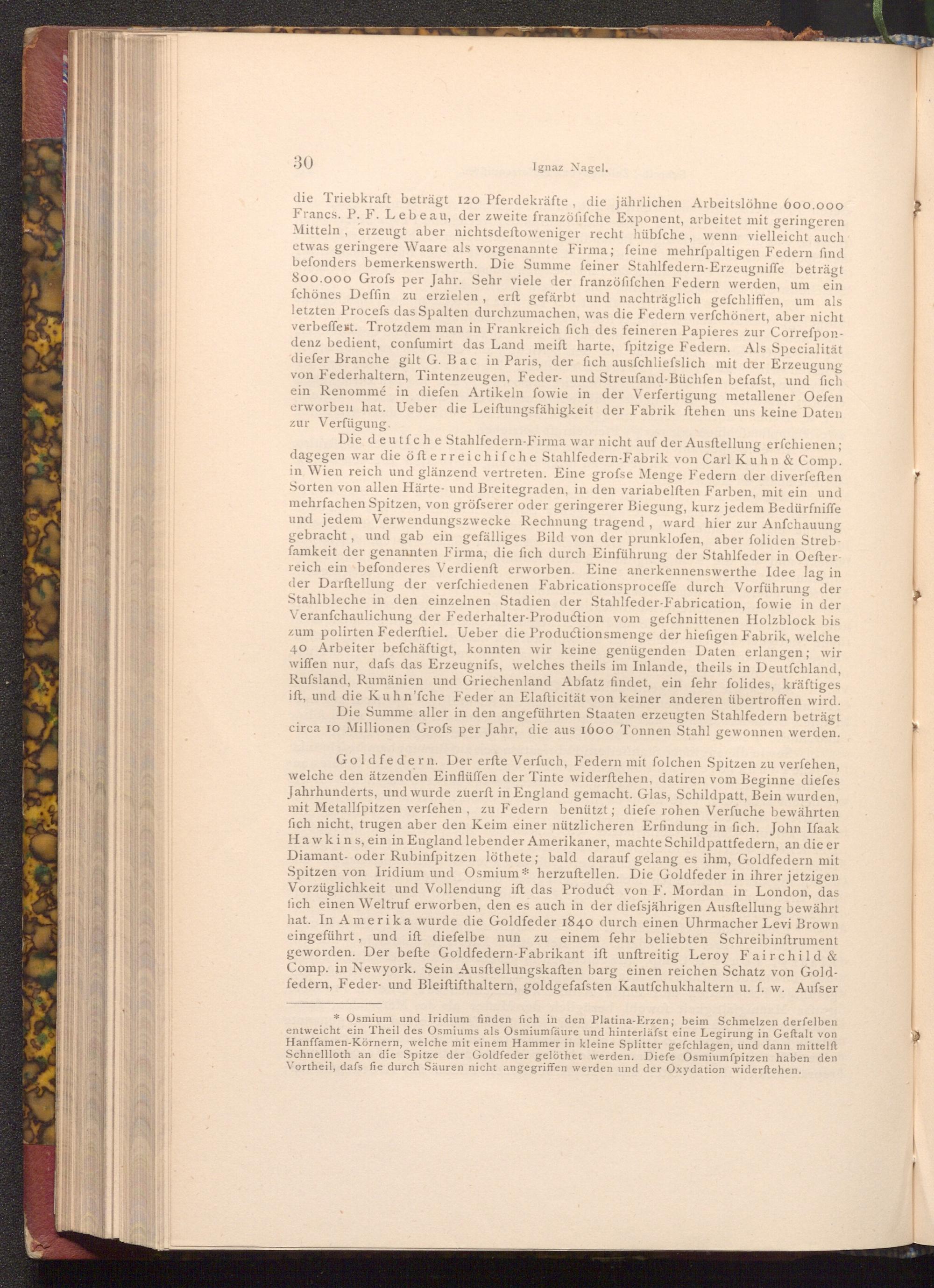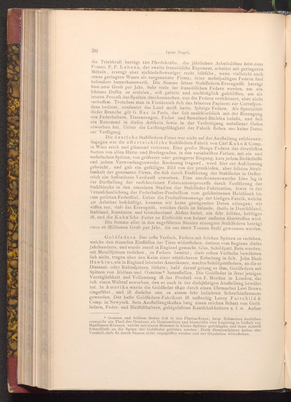 Goldfedern. Der erfte Verfuch, Federn mit folchen Spitzen zu verfehen, welche den ätzenden Einflüffen der Tinte widerftehen, datiren vom Beginne diefes Jahrhunderts, und wurde zuerft in England gemacht. Glas, Schildpatt, Bein wurden, mit Metallfpitzen verfehen, zu Federn benützt; diefe rohen Verfuche bewährten fich nicht, trugen aber den Keim einer nützlicheren Erfindung in fich. John Ifaak Hawkins, ein in England lebender Amerikaner, machte Schildpattfedern, an die er Diamant- oder Rubinfpitzen löthete; bald darauf gelang es ihm, Goldfedern mit Spitzen von Iridium und Osmium* herzuftellen. Die Goldfeder in ihrer jetzigen Vorzüglichkeit und Vollendung ift das Product von F. Mordan in London, das fich einen Weltruf erworben, den es auch in der diefsjährigen Ausftellung bewährt hat. In Amerika wurde die Goldfeder 1840 durch einen Uhrmacher Levi Brown eingeführt, und ift diefelbe nun zu einem fehr beliebten Schreibinftrument geworden. Der befte Goldfedern- Fabrikant ift unftreitig Leroy Fairchild& Comp. in Newyork. Sein Ausftellungskaften barg einen reichen Schatz von Goldfedern, Feder- und Bleiftifthaltern, goldgefafsten Kautfchukhaltern u. f. w. Aufser