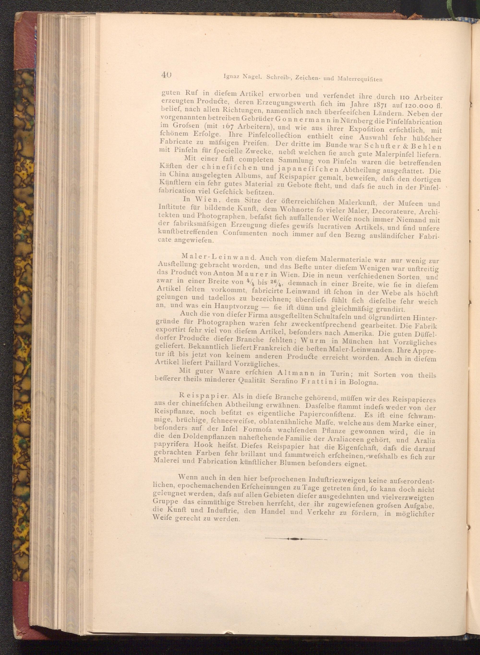 guten Ruf in diefem Artikel erworben und verfendet ihre durch 110 Arbeiter erzeugten Producte, deren Erzeugungswerth fich im Jahre 1871 auf 120.000 fl. belief, nach allen Richtungen, namentlich nach überfeeifchen Ländern. Neben der vorgenannten betreiben Gebrüder Gonnermann in Nürnberg die Pinfelfabrication im Grofsen( mit 167 Arbeitern), und wie aus ihrer Expofition erfichtlich, mit fchönem Erfolge. Ihre Pinfelcollection enthielt eine Auswahl fehr hübfcher Fabricate zu mäfsigen Preifen. Der dritte im Bunde war Schufter& Behlen mit Pinfeln für fpecielle Zwecke, nebft welchen fie auch gute Malerpinfel liefern. Mit einer faft completen Sammlung von Pinfeln waren die betreffenden Käften der chinefifchen und japanefifchen Abtheilung ausgeftattet. Die in China ausgelegten Albums, auf Reispapier gemalt, beweifen, dafs den dortigen Künftlern ein fehr gutes Material zu Gebote fteht, und dafs fie auch in der Pinfelfabrication viel Gefchick befitzen.