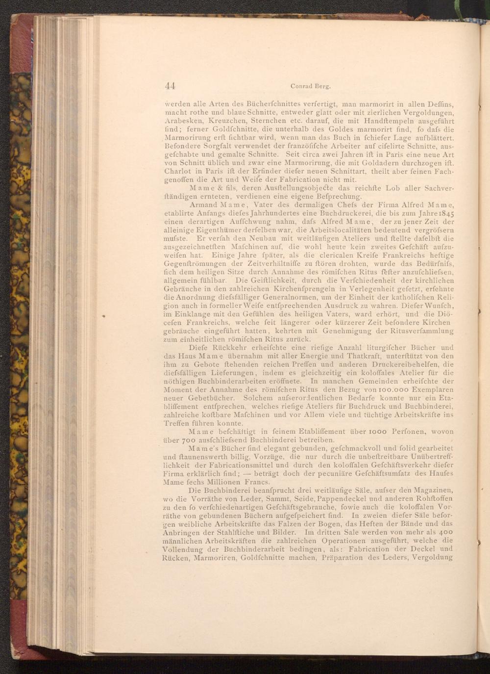 Diefe Rückkehr erheifchte eine riefige Anzahl liturgifcher Bücher und das Haus Mame übernahm mit aller Energie und Thatkraft, unterſtützt von den ihm zu Gebote ftehenden reichen Preffen und anderen Druckereibehelfen, die diefsfälligen Lieferungen, indem es gleichzeitig ein koloffales Atelier für die nöthigen Buchbinderarbeiten eröffnete. In manchen Gemeinden erheifchte der Moment der Annahme des römifchen Ritus den Bezug von 100.000 Exemplaren neuer Gebetbücher. Solchem aufserordentlichen Bedarfe konnte nur ein Etabliffement entſprechen, welches riefige Ateliers für Buchdruck und Buchbinderei, zahlreiche koftbare Mafchinen und vor Allem viele und tüchtige Arbeitskräfte ins Treffen führen konnte.