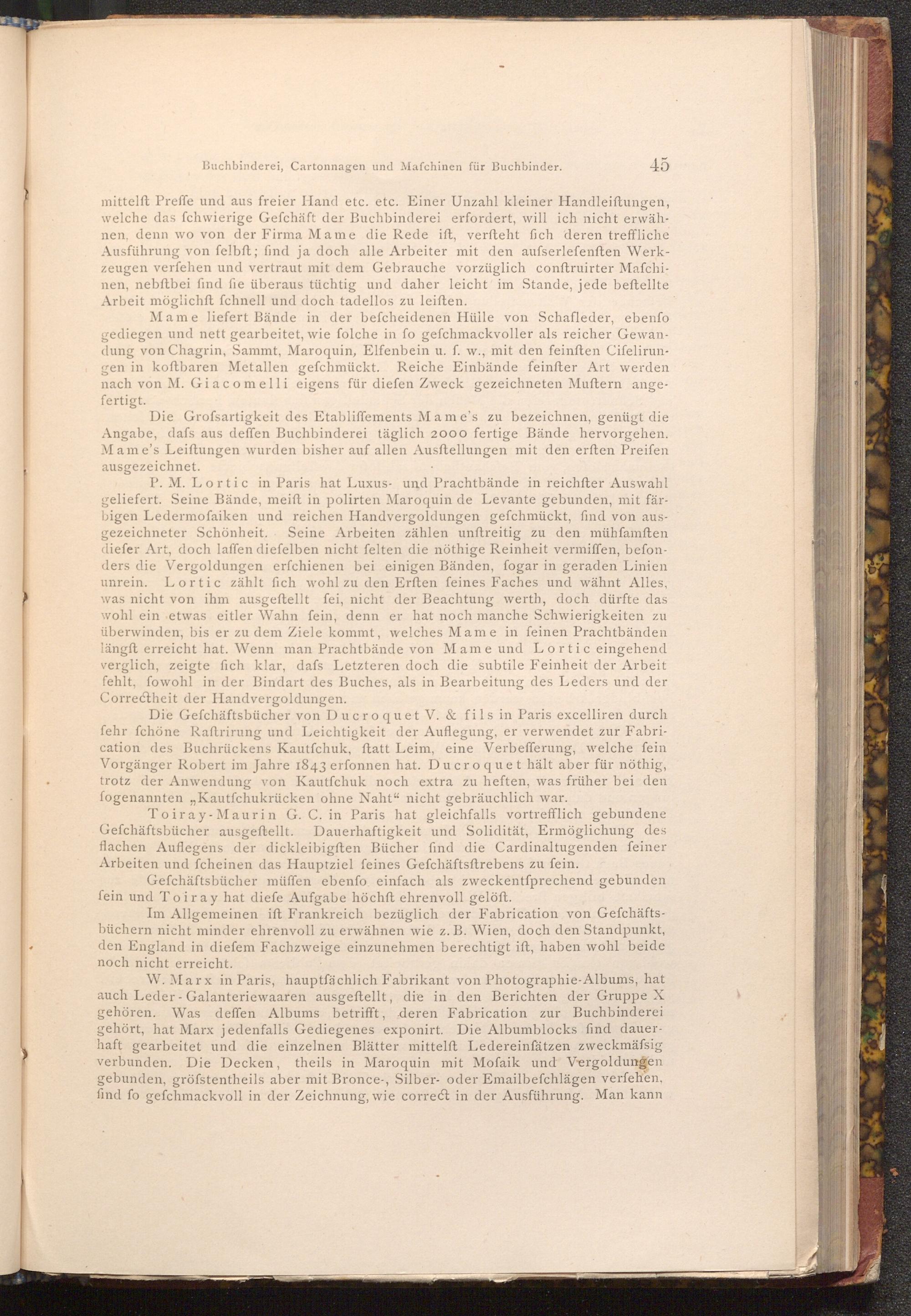 P. M. Lortic in Paris hat Luxus- und Prachtbände in reichfter Auswahl geliefert. Seine Bände, meift in polirten Maroquin de Levante gebunden, mit färbigen Ledermofaiken und reichen Handvergoldungen gefchmückt, find von ausgezeichneter Schönheit. Seine Arbeiten zählen unftreitig zu den mühfamften diefer Art, doch laffen diefelben nicht felten die nöthige Reinheit vermiffen, befonders die Vergoldungen erfchienen bei einigen Bänden, fogar in geraden Linien unrein. Lortic zählt fich wohl zu den Erften feines Faches und wähnt Alles, was nicht von ihm ausgeftellt fei, nicht der Beachtung werth, doch dürfte das wohl ein etwas eitler Wahn fein, denn er hat noch manche Schwierigkeiten zu überwinden, bis er zu dem Ziele kommt, welches Mame in feinen Prachtbänden längst erreicht hat. Wenn man Prachtbände von Mame und Lortic eingehend verglich, zeigte fich klar, dafs Letzteren doch die subtile Feinheit der Arbeit fehlt, fowohl in der Bindart des Buches, als in Bearbeitung des Leders und der Correctheit der Handvergoldungen.