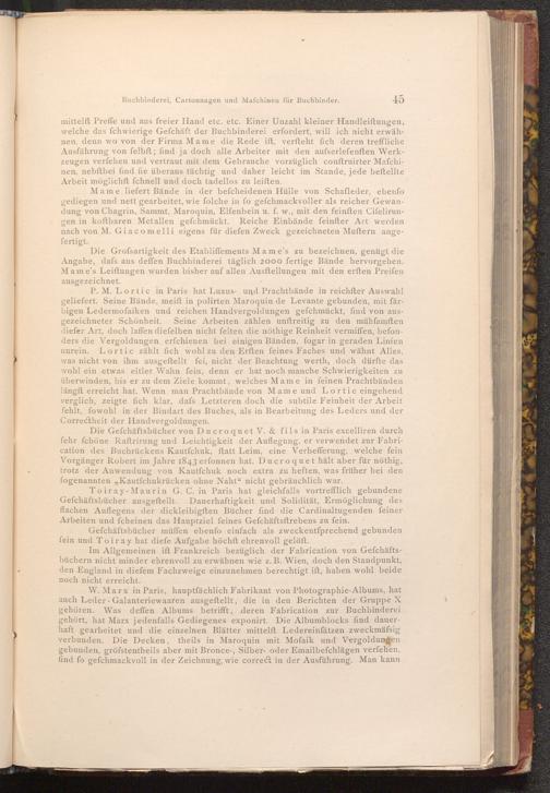 Mame liefert Bände in der befcheidenen Hülle von Schafleder, ebenfo gediegen und nett gearbeitet, wie folche in fo gefchmackvoller als reicher Gewandung von Chagrin, Sammt, Maroquin, Elfenbein u. f. w., mit den feinften Cifelirungen in koftbaren Metallen gefchmückt. Reiche Einbände feinfter Art werden nach von M. Giacomelli eigens für diefen Zweck gezeichneten Muftern angefertigt. Die Grofsartigkeit des Etabliffements Mame's zu bezeichnen, genügt die Angabe, dafs aus deffen Buchbinderei täglich 2000 fertige Bände hervorgehen. Mame's Leiftungen wurden bisher auf allen Ausftellungen mit den erften Preifen ausgezeichnet.