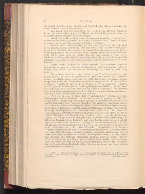 Obwohl jeder Sachverständige auf den erften Blick und ohne ein Buch in die Hand genommen zu haben, erkennen mufste, dafs die Arbeit eine gediegene und von Meifterhand ausgeführte fei, hat man Lachnik doch die geringfte Aus zeichnung gegeben. Es ift eine fchreiende Ungerechtigkeit, die höchft verdienftvolle Arbeit eines tüchtigen Induftriellen mit dem geringften Preife auszuzeichnen, umfomehr als manche Ausfteller unferer Branche Verdienftmedaillen erhielten, deren Arbeiten mit denen Lachnik's nicht im Entfernteften fich meffen konnten.
