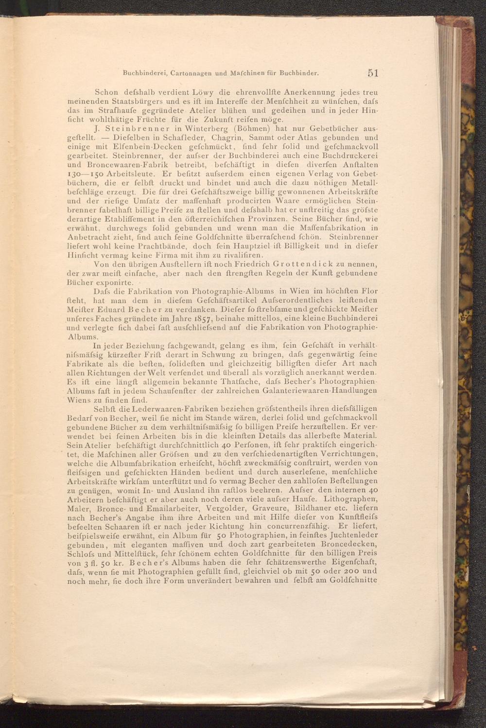 Selbft die Lederwaaren- Fabriken beziehen gröfstentheils ihren diefsfälligen Bedarf von Becher, weil fie nicht im Stande wären, derlei folid und gefchmackvoll gebundene Bücher zu dem verhältnifsmäfsig fo billigen Preife herzuftellen. Er verwendet bei feinen Arbeiten bis in die kleinften Details das allerbefte Material. Sein Atelier befchäftigt durchschnittlich 40 Perfonen, ift fehr praktiſch eingerichtet, die Maſchinen aller Gröfsen und zu den verfchiedenartigften Verrichtungen, welche die Albumfabrikation erheifcht, höchft zweckmäfsig conftruirt, werden von fleifsigen und gefchickten Händen bedient und durch auserlefene, menfchliche Arbeitskräfte wirkfam unterſtützt und fo vermag Becher den zahllofen Beftellungen zu genügen, womit In- und Ausland ihn raftlos beehren. Aufser den internen 40 Arbeitern befchäftigt er aber auch noch deren viele aufser Haufe. Lithographen, Maler, Bronce- und Emailarbeiter, Vergolder, Graveure, Bildhauer etc. liefern nach Becher's Angabe ihm ihre Arbeiten und mit Hilfe diefer von Kunftfleifs befeelten Schaaren ift er nach jeder Richtung hin concurrenzfähig. Er liefert, beiſpielsweife erwähnt, ein Album für 50 Photographien, in feinftes Juchtenleder gebunden, mit eleganten maffiven und doch zart gearbeiteten Broncedecken, Schlofs und Mittelftück, fehr fchönem echten Goldfchnitte für den billigen Preis von 3 fl. 50 kr. Becher's Albums haben die fehr fchätzenswerthe Eigenfchaft, dafs, wenn fie mit Photographien gefüllt find, gleichviel ob mit 50 oder 200 und noch mehr, fie doch ihre Form unverändert bewahren und felbft am Goldfchnitte
