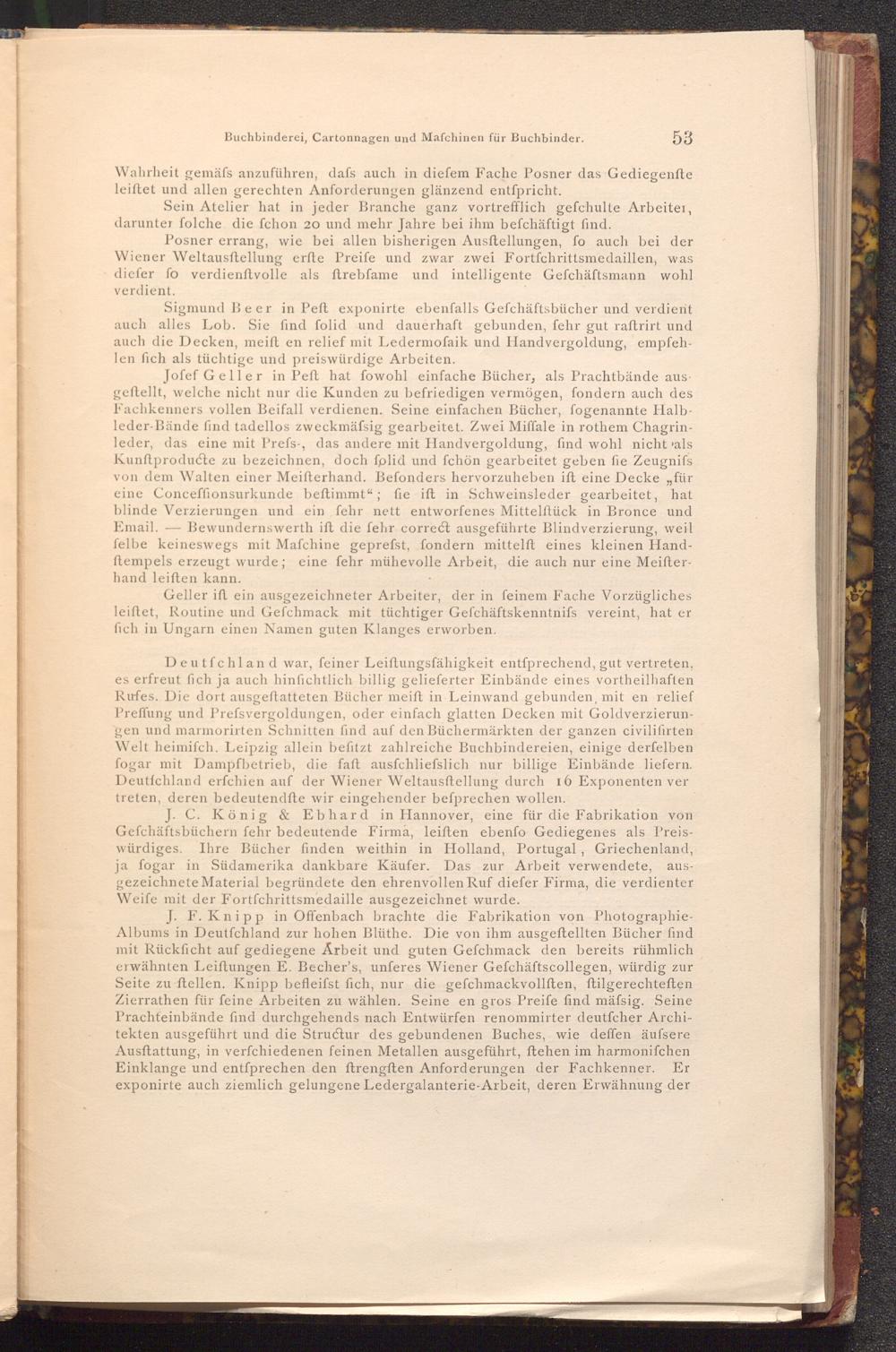 Sigmund Beer in Peft exponirte ebenfalls Gefchäftsbücher und verdient auch alles Lob. Sie find folid und dauerhaft gebunden, fehr gut raftrirt und auch die Decken, meift en relief mit Ledermofaik und Handvergoldung, empfehlen fich als tüchtige und preiswürdige Arbeiten.