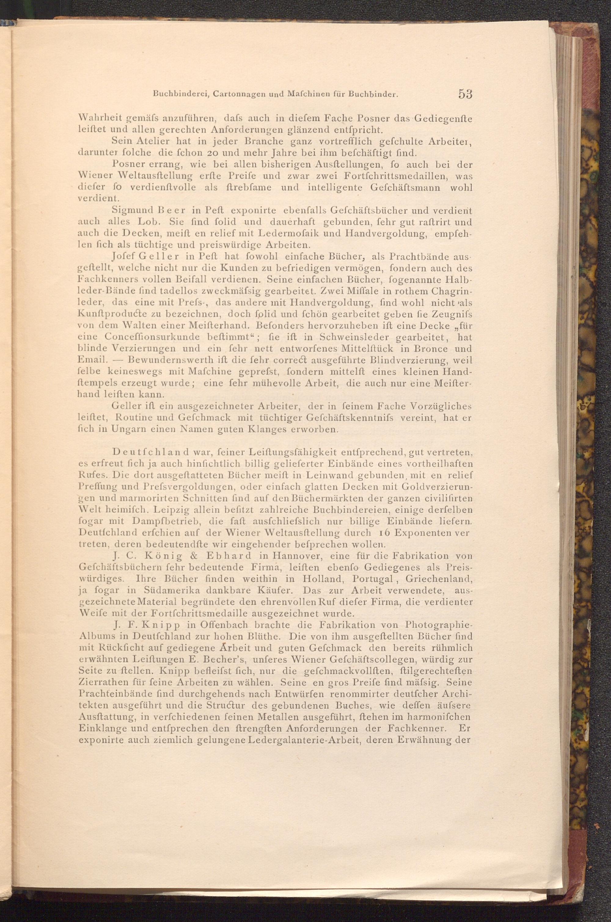Deutfchland war, feiner Leiftungsfähigkeit entfprechend, gut vertreten, es erfreut fich ja auch hinsichtlich billig gelieferter Einbände eines vortheilhaften Rufes. Die dort ausgeftatteten Bücher meift in Leinwand gebunden, mit en relief Preffung und Prefsvergoldungen, oder einfach glatten Decken mit Goldverzierungen und marmorirten Schnitten find auf den Büchermärkten der ganzen civilifirten Welt heimifch. Leipzig allein befitzt zahlreiche Buchbindereien, einige derfelben fogar mit Dampfbetrieb, die faft ausfchliefslich nur billige Einbände liefern. Deutfchland erfchien auf der Wiener Weltausftellung durch 16 Exponenten ver treten, deren bedeutendfte wir eingehender befprechen wollen.