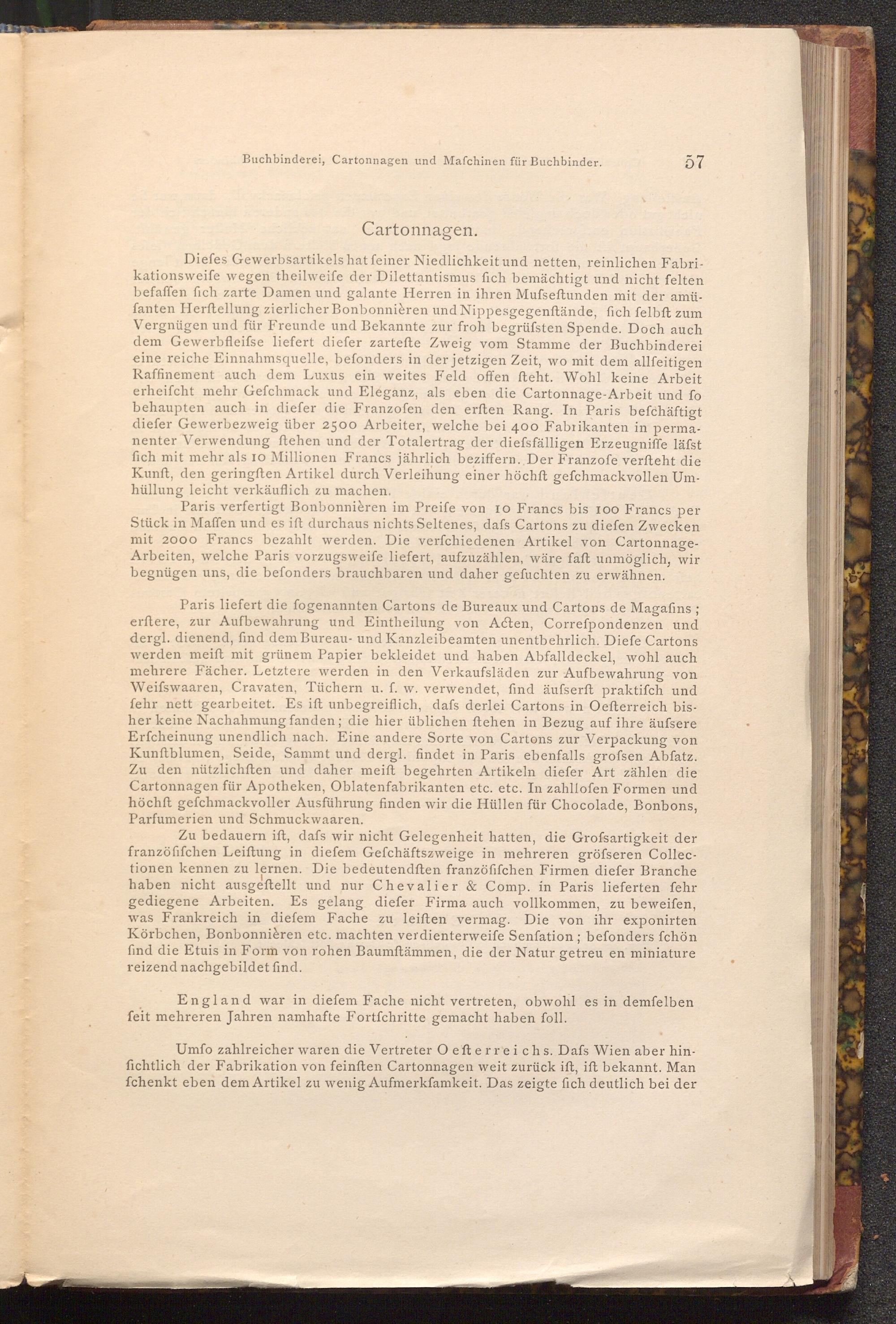 Paris verfertigt Bonbonnièren im Preife von 10 Francs bis 100 Francs per Stück in Maffen und es ift durchaus nichts Seltenes, dafs Cartons zu diefen Zwecken mit 2000 Francs bezahlt werden. Die verfchiedenen Artikel von CartonnageArbeiten, welche Paris vorzugsweife liefert, aufzuzählen, wäre faft unmöglich, wir begnügen uns, die befonders brauchbaren und daher gefuchten zu erwähnen.