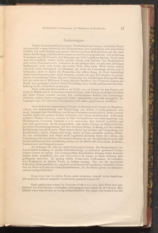 Umfo zahlreicher waren die Vertreter Oefterreichs. Dafs Wien aber hinfichtlich der Fabrikation von feinften Cartonnagen weit zurück ift, ift bekannt. Man fchenkt eben dem Artikel zu wenig Aufmerkſamkeit. Das zeigte fich deutlich bei der