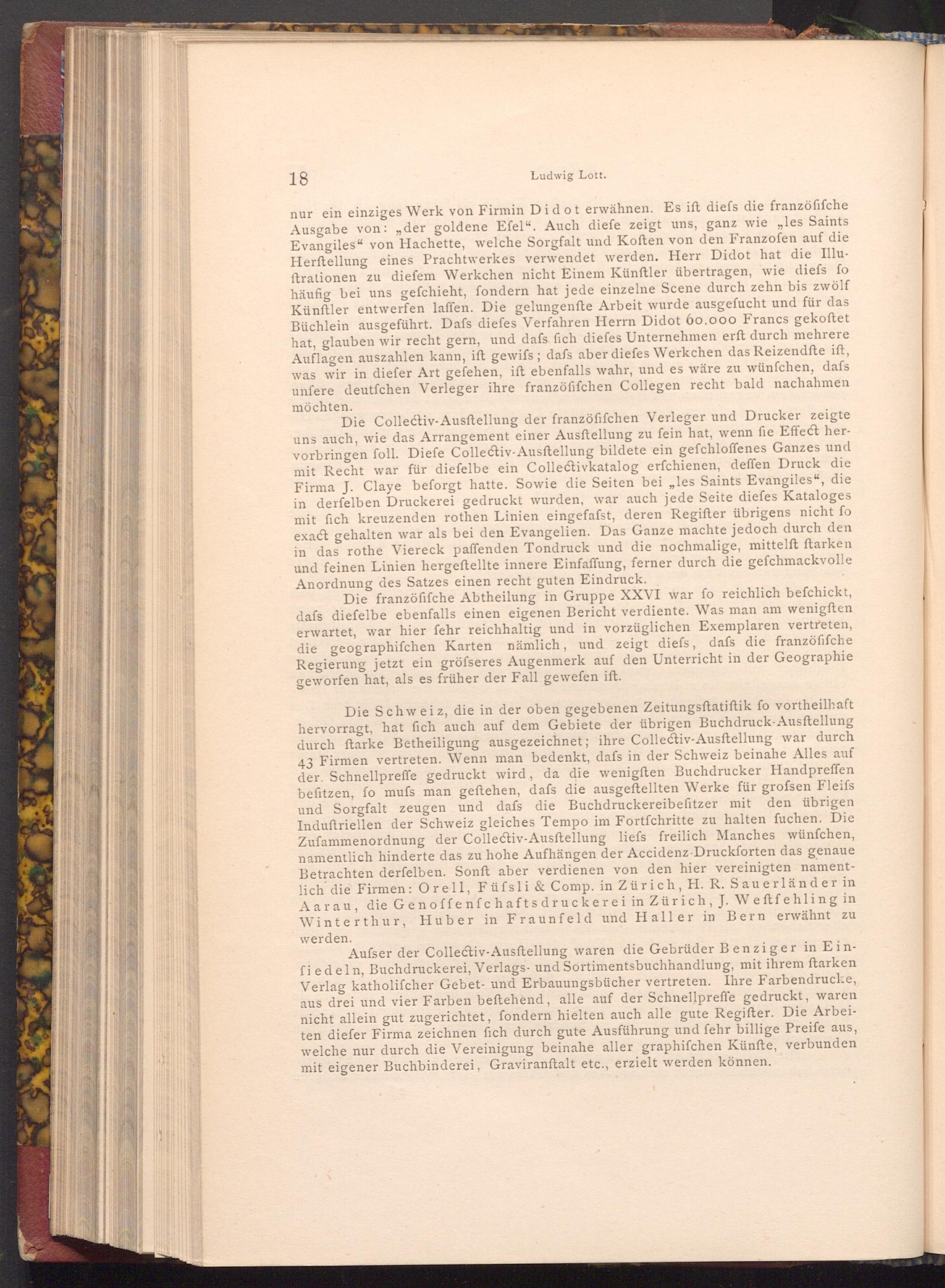Aufser der Collectiv- Ausftellung waren die Gebrüder Benziger in Einfiedeln, Buchdruckerei, Verlags- und Sortimentsbuchhandlung, mit ihrem ſtarken Verlag katholifcher Gebet- und Erbauungsbücher vertreten. Ihre Farbendrucke, aus drei und vier Farben beftehend, alle auf der Schnellpreffe gedruckt, waren nicht allein gut zugerichtet, fondern hielten auch alle gute Regifter. Die Arbeiten diefer Firma zeichnen fich durch gute Ausführung und fehr billige Preife aus, welche nur durch die Vereinigung beinahe aller graphifchen Künfte, verbunden mit eigener Buchbinderei, Graviranftalt etc., erzielt werden können.