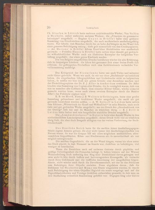E. B. ter Horft, Firma J. B. Wolters in Gröningen, hatte eine grofse Sammlung gebundener und brofchirter Werke ausgeftellt, die meift als gut. gedruckt bezeichnet werden müffen. A. W. Sy th off in Leiden hatte neben dem fchönen, Wörterbuch der Kunft und Wiffenfchaft" in zehn Bänden, auch noch viele und gut gedruckte Werke ausgeftellt; nur der Druck des ,, Gendenkbook van der Oorlog" liefs hie und da Manches zu wünſchen übrig. E. J. Brill in Leiden hatte fauber und rein hergestellte arabifche Drucke ausgeftellt.