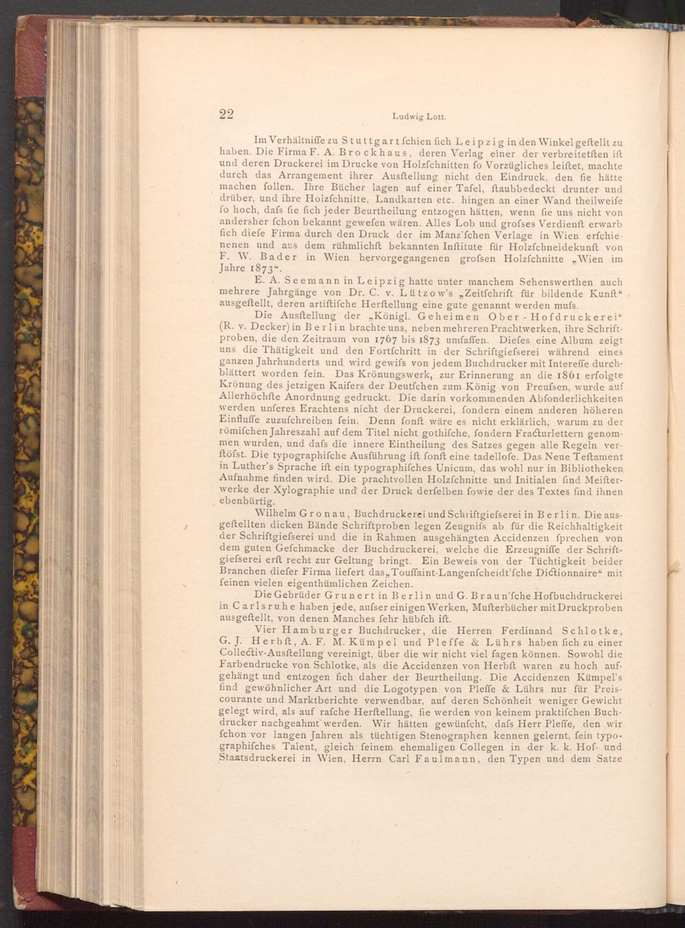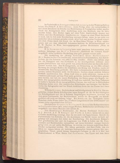 Im Verhältniffe zu Stuttgart fchien fich Leipzig in den Winkel geftellt zu haben. Die Firma F. A. Brockhaus, deren Verlag einer der verbreitetften ift und deren Druckerei im Drucke von Holzfchnitten fo Vorzügliches leiftet, machte durch das Arrangement ihrer Ausftellung nicht den Eindruck, den fie hätte machen follen. Ihre Bücher lagen auf einer Tafel, ftaubbedeckt drunter und drüber, und ihre Holzfchnitte, Landkarten etc. hingen an einer Wand theilweife fo hoch, dafs fie fich jeder Beurtheilung entzogen hätten, wenn fie uns nicht von andersher fchon bekannt gewefen wären. Alles Lob und grofses Verdienft erwarb fich diefe Firma durch den Druck der im Manz'fchen Verlage in Wien erfchie. nenen und aus dem rühmlichft bekannten Inftitute für Holzfchneidekunft von F. W. Bader in Wien hervorgegangenen grofsen Holzfchnitte„ Wien im Jahre 1873".