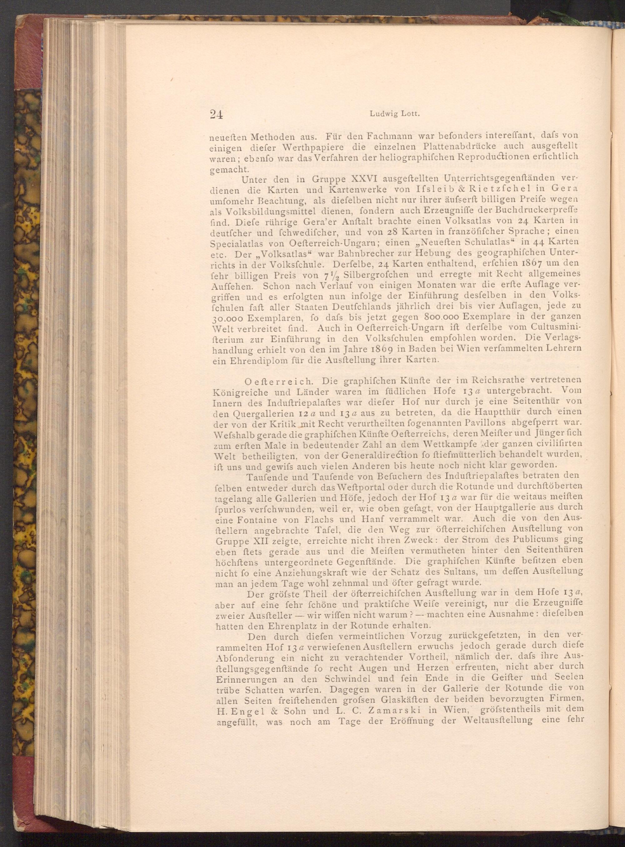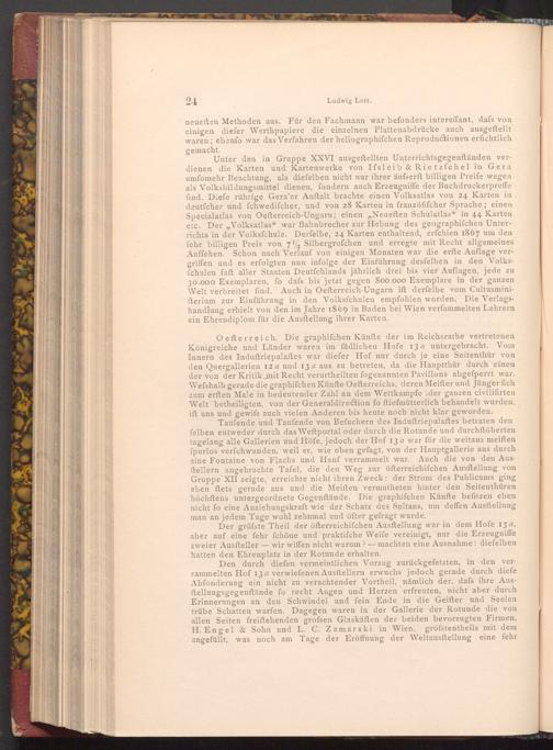Unter den in Gruppe XXVI ausgeftellten Unterrichtsgegenständen verdienen die Karten und Kartenwerke von Ifsleib& Rietzfchel in Gera umfomehr Beachtung, als diefelben nicht nur ihrer äufserft billigen Preife wegen als Volksbildungsmittel dienen, fondern auch Erzeugniffe der Buchdruckerpreffe find. Diefe rührige Gera'er Anftalt brachte einen Volksatlas von 24 Karten in deutfcher und fchwediſcher, und von 28 Karten in franzöfifcher Sprache; einen Specialatlas von Oefterreich- Ungarn; einen Neueften Schulatlas" in 44 Karten etc. Der„ Volksatlas" war Bahnbrecher zur Hebung des geographifchen Unterrichts in der Volksfchule. Derfelbe, 24 Karten enthaltend, erfchien 1867 um den fehr billigen Preis von 72 Silbergrofchen und erregte mit Recht allgemeines Auffehen. Schon nach Verlauf von einigen Monaten war die erfte Auflage vergriffen und es erfolgten nun infolge der Einführung desfelben in den Volksfchulen faft aller Staaten Deutfchlands jährlich drei bis vier Auflagen, jede zu 30.000 Exemplaren, fo dafs bis jetzt gegen 800.000 Exemplare in der ganzen Welt verbreitet find. Auch in Oefterreich- Ungarn ift derfelbe vom Cultusminifterium zur Einführung in den Volksfchulen empfohlen worden. Die Verlagshandlung erhielt von den im Jahre 1869 in Baden bei Wien verfammelten Lehrern ein Ehrendiplom für die Ausftellung ihrer Karten.