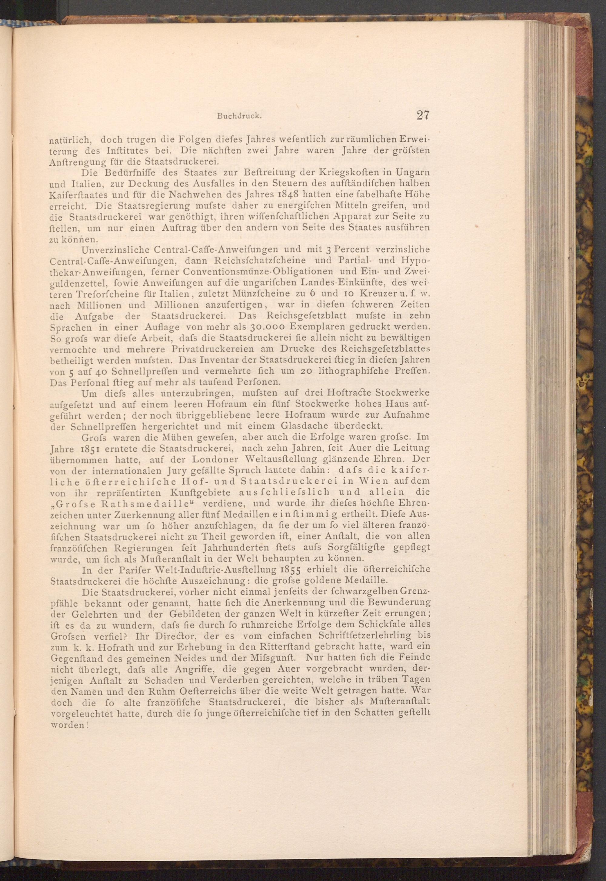 Grofs waren die Mühen gewefen, aber auch die Erfolge waren grofse. Im Jahre 1851 erntete die Staatsdruckerei, nach zehn Jahren, feit Auer die Leitung übernommen hatte, auf der Londoner Weltausftellung glänzende Ehren. Der von der internationalen Jury gefällte Spruch lautete dahin: dafs die kaiferliche öfterreichifche Hof- und Staatsdruckerei in Wien auf dem von ihr repräfentirten Kunftgebiete aus fchliefs lich und allein die " Grofse Rathsmedaille" verdiene, und wurde ihr diefes höchfte Ehrenzeichen unter Zuerkennung aller fünf Medaillen einftimmig ertheilt. Diefe Auszeichnung war um fo höher anzufchlagen, da fie der um fo viel älteren franzö fifchen Staatsdruckerei nicht zu Theil geworden ift, einer Anftalt, die von allen franzöfifchen Regierungen feit Jahrhunderten ftets aufs Sorgfältigfte gepflegt wurde, um fich als Mufteranſtalt in der Welt behaupten zu können.