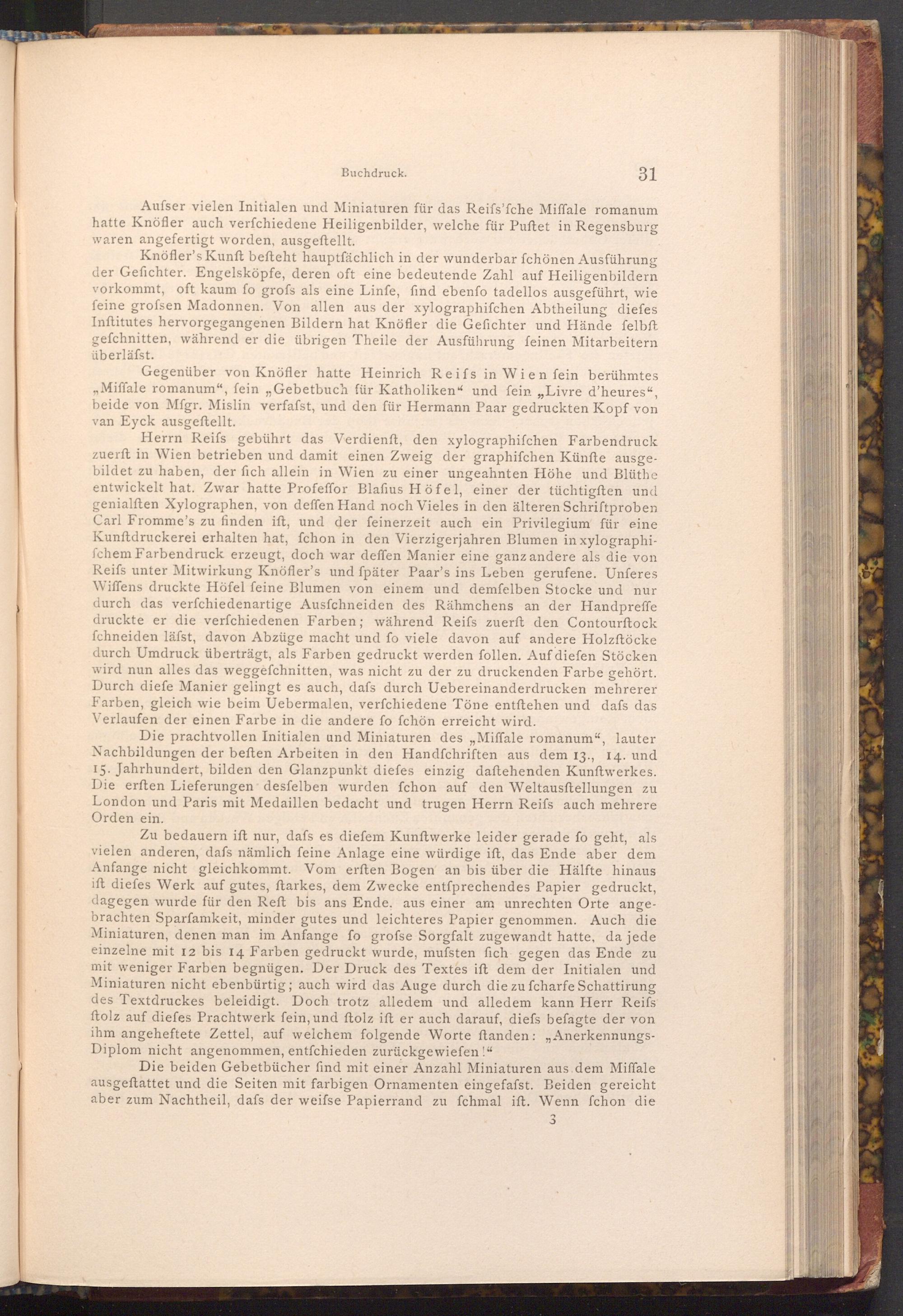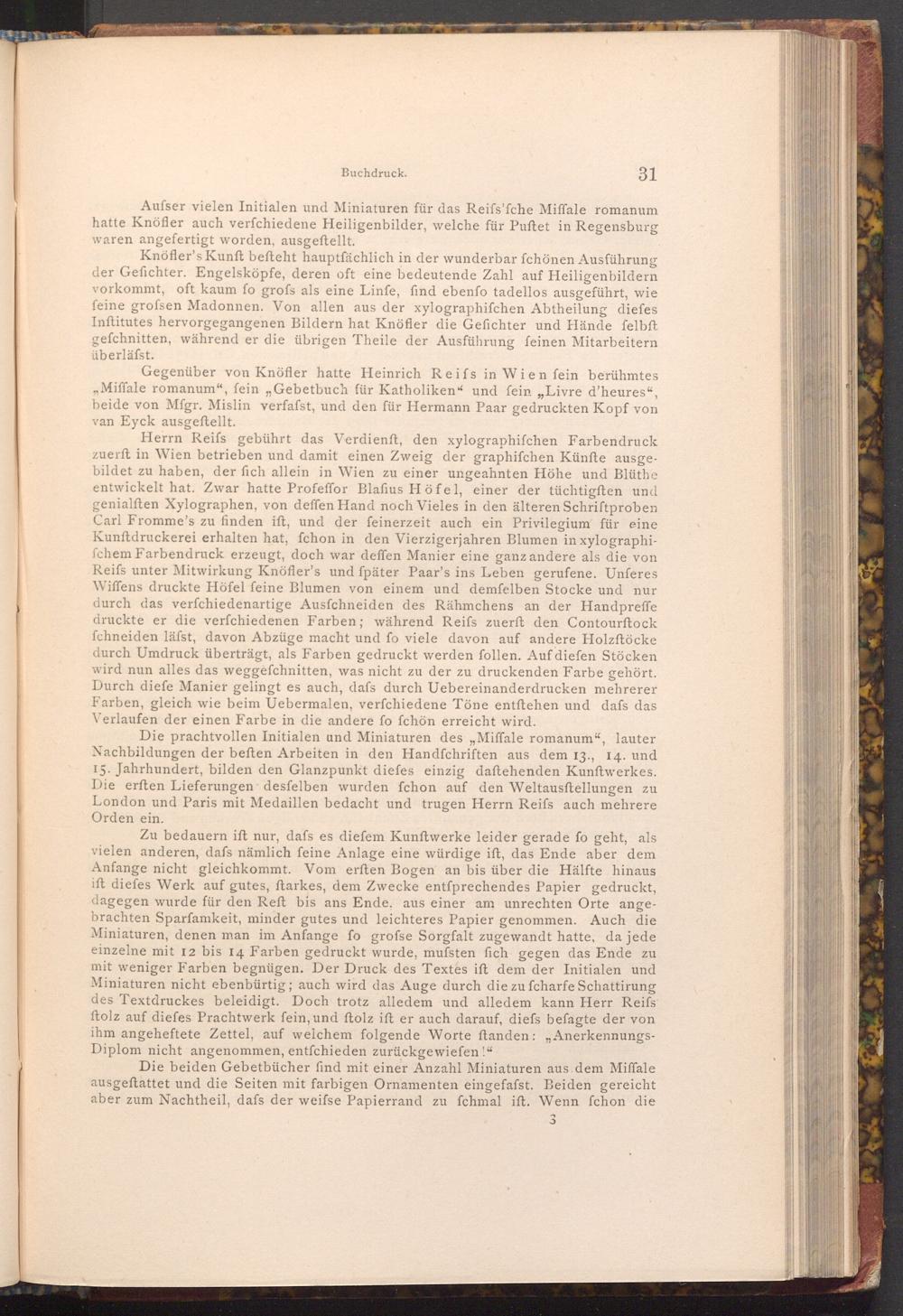 Gegenüber von Knöfler hatte Heinrich Reifs in Wien fein berühmtes Miffale romanum", fein ,, Gebetbuch für Katholiken" und fein ,, Livre d'heures", beide von Mfgr. Mislin verfafst, und den für Hermann Paar gedruckten Kopf von van Eyck ausgeftellt.