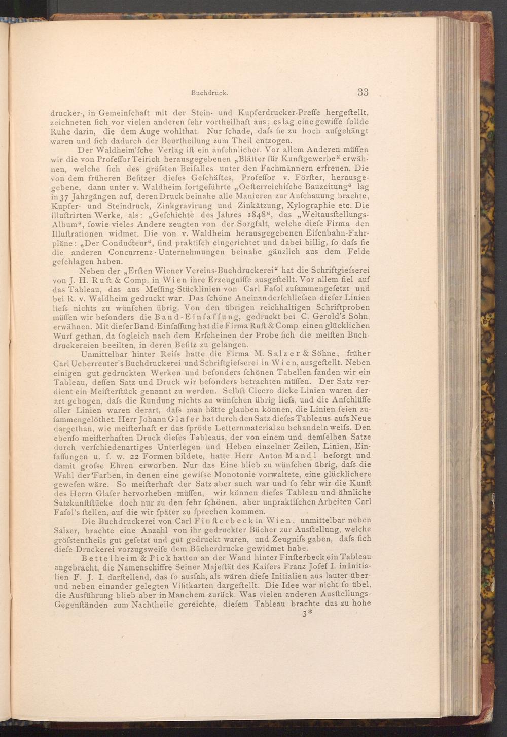 Die Buchdruckerei von Carl Finfterbeck in Wien, unmittelbar neben Salzer, brachte eine Anzahl von ihr gedruckter Bücher zur Ausstellung, welche gröfstentheils gut gefetzt und gut gedruckt waren, und Zeugnifs gaben, dafs fich diefe Druckerei vorzugsweife dem Bücherdrucke gewidmet habe.