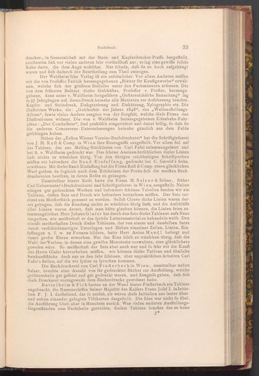 Unmittelbar hinter Reifs hatte die Firma M. Salzer& Söhne, früher Carl Ueberreuter's Buchdruckerei und Schriftgiefserei in Wien, ausgeftellt. Neben einigen gut gedruckten Werken und befonders fchönen Tabellen fanden wir ein Tableau, deffen Satz und Druck wir befonders betrachten müffen. Der Satz verdient ein Meifterſtück genannt zu werden. Selbft Cicero dicke Linien waren der. art gebogen, dafs die Rundung nichts zu wünſchen übrig liefs, und die Anfchlüffe aller Linien waren derart, dafs man hätte glauben können, die Linien feien zufammengelöthet. Herr Johann Glafer hat durch den Satz diefes Tableaus aufs Neue dargethan, wie meiſterhaft er das fpröde Letternmaterial zu behandeln weifs. Den ebenfo meifterhaften Druck diefes Tableaus, der von einem und demfelben Satze durch verfchiedenartiges Unterlegen und Heben einzelner Zeilen, Linien, Einfaffungen u. f. w. 22 Formen bildete, hatte Herr Anton Mandl beforgt und damit grofse Ehren erworben. Nur das Eine blieb zu wünfchen übrig, dafs die Wahl der Farben, in denen eine gewisse Monotonie vorwaltete, eine glücklichere gewefen wäre. So meifterhaft der Satz aber auch war und fo fehr wir die Kunft des Herrn Glafer hervorheben müffen, wir können diefes Tableau und ähnliche Satzkunftftücke doch nur zu den fehr fchönen, aber unpraktifchen Arbeiten Carl Fafol's ftellen, auf die wir fpäter zu fprechen kommen.
