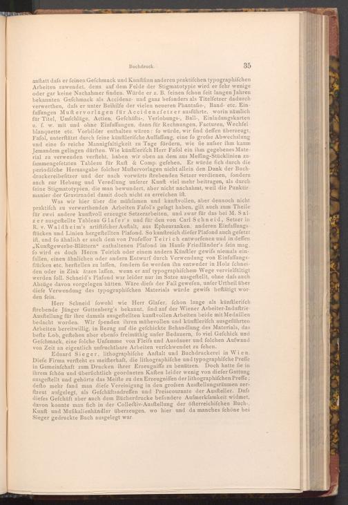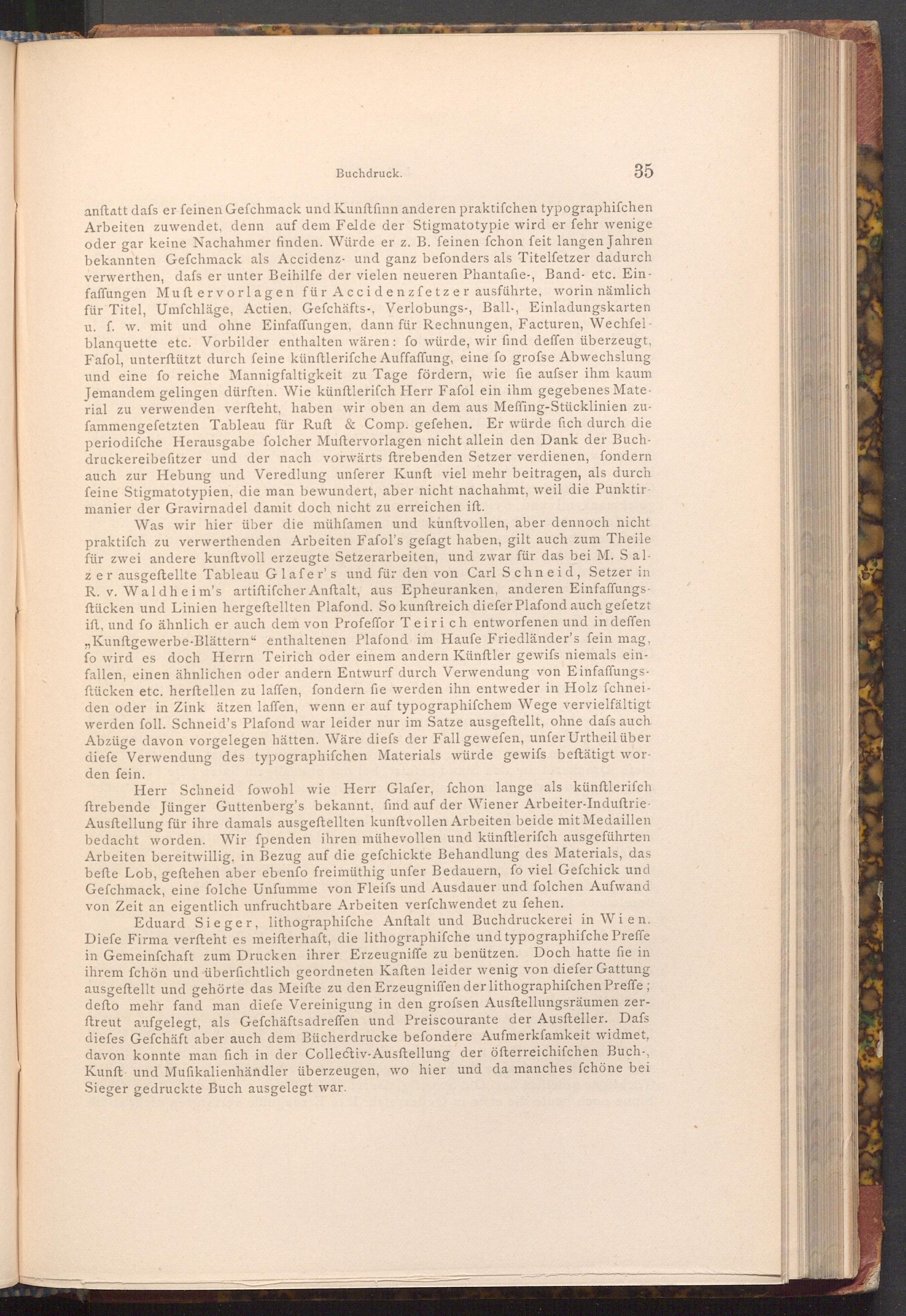 Eduard Sieger, lithographifche Anftalt und Buchdruckerei in Wien. Diefe Firma verfteht es meifterhaft, die lithographifche und typographifche Preffe in Gemeinfchaft zum Drucken ihrer Erzeugniffe zu benützen. Doch hatte fie in ihrem fchön und überfichtlich geordneten Kaften leider wenig von diefer Gattung ausgeftellt und gehörte das Meifte zu den Erzeugniffen der lithographifchen Preffe; defto mehr fand man diefe Vereinigung in den grofsen Ausftellungsräumen zerftreut aufgelegt, als Gefchäftsadreffen und Preiscourante der Ausfteller. Dafs diefes Gefchäft aber auch dem Bücherdrucke befondere Aufmerkfamkeit widmet, davon konnte man fich in der Collectiv- Ausftellung der öfterreichifchen Buch-, Kunft und Mufikalienhändler überzeugen, wo hier und da manches fchöne bei Sieger gedruckte Buch ausgelegt war.