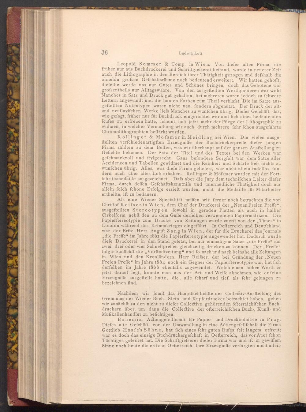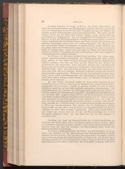 Leopold Sommer& Comp. in Wien. Von diefer alten Firma, die früher nur aus Buchdruckerei und Schriftgiefserei beftand, wurde in neuerer Zeit auch die Lithographie in den Bereich ihrer Thätigkeit gezogen und defshalb die ohnehin grofsen Gefchäftsräume noch bedeutend erweitert. Wir hatten gehofft, diefelbe werde uns nur Gutes und Schönes bringen, doch das Gebotene war grofsentheils nur Alltagswaare. Von den ausgeftellten Werthpapieren war wohl Manches in Satz und Druck gut gehalten, bei mehreren waren jedoch zu fchwere Lettern angewandt und die bunten Farben zum Theil verblafst. Die im Satze ausgeftellten Notentypen waren nicht neu, fondern abgenützt. Der Druck der altund neuflavifchen Werke liefs Manches zu wünfchen übrig. Diefes Gefchäft, das, wie gefagt, früher nur für Buchdruck eingerichtet war und fich eines bedeutenden Rufes zu erfreuen hatte, fcheint fich jetzt mehr der Pflege der Lithographie zu widmen, in welcher Vermuthung wir auch durch mehrere fehr fchön ausgeführte Chromolithographien beftärkt wurden.