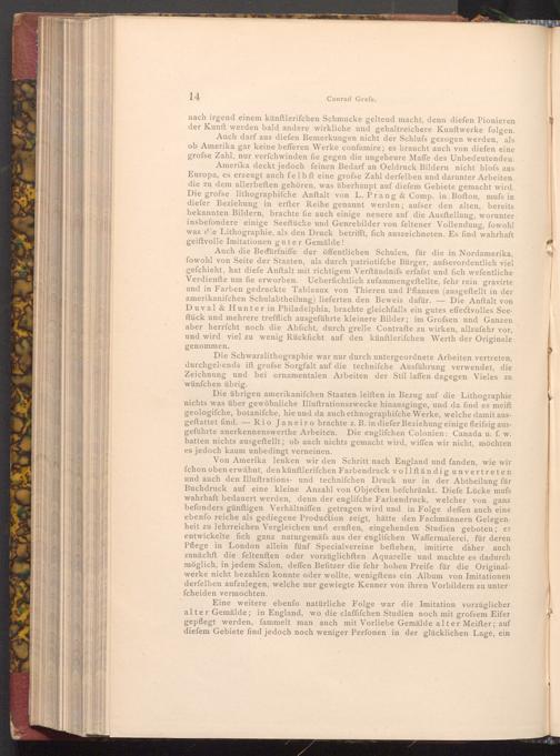 Von Amerika lenken wir den Schritt nach England und fanden, wie wir fchon oben erwähnt, den künftlerifchen Farbendruck vollständig unvertreten und auch den Illuftrations- und technifchen Druck nur in der Abtheilung für Buchdruck auf eine kleine Anzahl von Objecten befchränkt. Diefe Lücke mufs wahrhaft bedauert werden, denn der englifche Farbendruck, welcher von ganz befonders günftigen Verhältniffen getragen wird und in Folge deffen auch eine ebenfo reiche als gediegene Production zeigt, hätte den Fachmännern Gelegenheit zu lehrreichen Vergleichen und ernften, eingehenden Studien geboten; er entwickelte fich ganz naturgemäfs aus der englifchen Waffermalerei, für deren Pflege in London allein fünf Specialvereine beftehen, imitirte daher auch zunächft die feltenften oder vorzüglichften Aquarelle und machte es dadurch möglich, in jedem Salon, deffen Befitzer die fehr hohen Preife für die Originalwerke nicht bezahlen konnte oder wollte, wenigftens ein Album von Imitationen derfelben aufzulegen, welche nur gewiegte Kenner von ihren Vorbildern zu unterfcheiden vermochten.