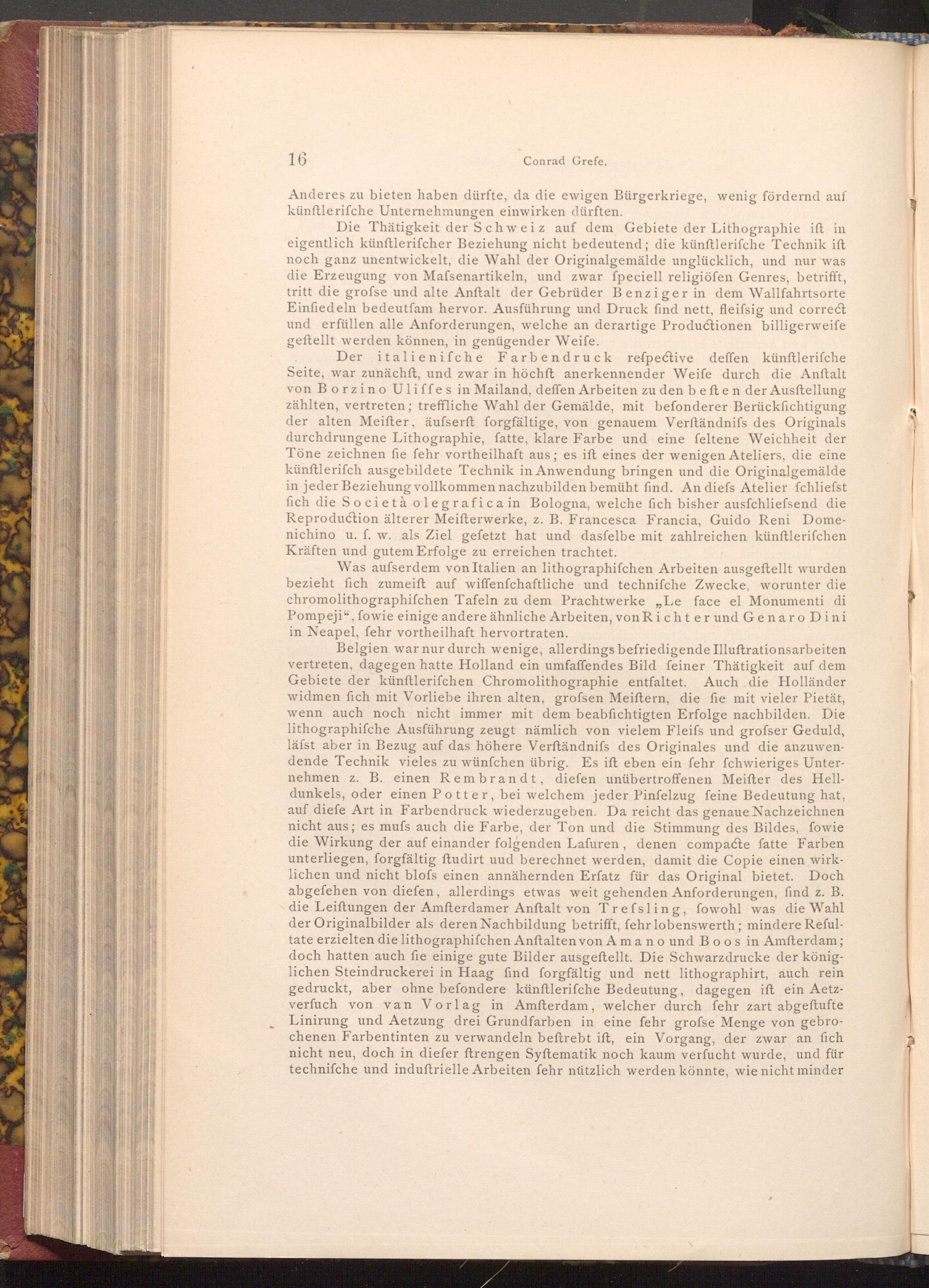 Die Thätigkeit der Schweiz auf dem Gebiete der Lithographie ift in eigentlich künftlerifcher Beziehung nicht bedeutend; die künftlerifche Technik ift noch ganz unentwickelt, die Wahl der Originalgemälde unglücklich, und nur was die Erzeugung von Mafsenartikeln, und zwar ſpeciell religiöfen Genres, betrifft, tritt die grofse und alte Anftalt der Gebrüder Benziger in dem Wallfahrtsorte Einsiedeln bedeutfam hervor. Ausführung und Druck find nett, fleifsig und correct und erfüllen alle Anforderungen, welche an derartige Productionen billigerweife geftellt werden können, in genügender Weife.