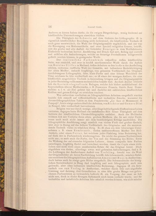 Der italienifche Farbendruck refpective deffen künftlerifche Seite, war zunächft, und zwar in höchft anerkennender Weife durch die Anftalt von Borzino Uliffes in Mailand, deffen Arbeiten zu den beften der Ausstellung zählten, vertreten; treffliche Wahl der Gemälde, mit befonderer Berücksichtigung der alten Meifter, äufserft forgfältige, von genauem Verſtändnifs des Originals durchdrungene Lithographie, fatte, klare Farbe und eine feltene Weichheit der Töne zeichnen fie fehr vortheilhaft aus; es ift eines der wenigen Ateliers, die eine künftlerisch ausgebildete Technik in Anwendung bringen und die Originalgemälde in jeder Beziehung vollkommen nachzubilden bemüht find. An diefs Atelier ſchliefst fich die Società olegrafica in Bologna, welche fich bisher ausfchliefsend die Reproduction älterer Meisterwerke, z. B. Francesca Francia, Guido Reni Domenichino u. f. w. als Ziel gefetzt hat und dasfelbe mit zahlreichen künftlerifchen Kräften und gutem Erfolge zu erreichen trachtet.