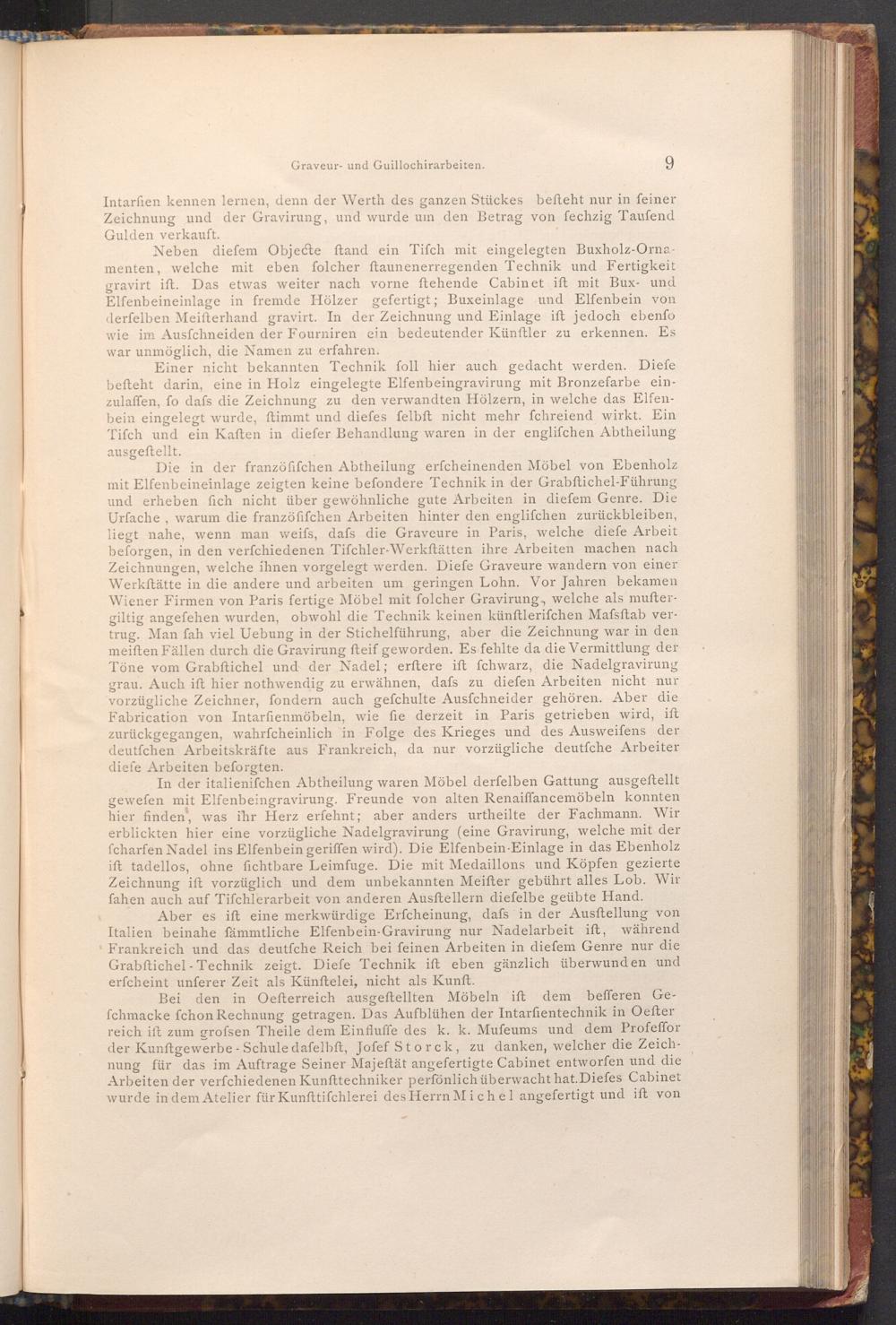 Bei den in Oefterreich ausgeftellten Möbeln ift dem befferen Gefchmacke fchon Rechnung getragen. Das Aufblühen der Intarfientechnik in Oefter reich ift zum grofsen Theile dem Einfluffe des k. k. Muſeums und dem Profeffor der Kunftgewerbe- Schule dafelbft, Jofef Storck, zu danken, welcher die Zeichnung für das im Auftrage Seiner Majeftät angefertigte Cabinet entworfen und die Arbeiten der verfchiedenen Kunfttechniker perfönlich überwacht hat. Diefes Cabinet wurde in dem Atelier für Kunfttifchlerei des Herrn Michel angefertigt und ist von