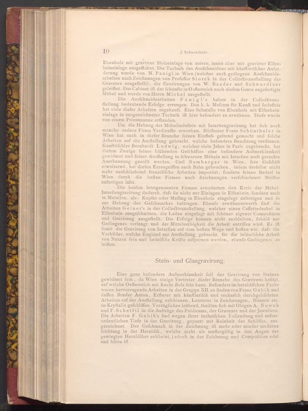 Eine ganz befondere Aufmerksamkeit foll der Gravirung von Steinen gewidmet fein, da Wien einige Vertreter diefer Branche des Gravirens befitzt, auf welche Oefterreich mit Recht ftolz fein kann. Befonders im heraldifchen Fache waren hervorragende Arbeiten in der Gruppe XII zu finden von Franz Gubik und deffen Bruder Anton, Erfterer mit künftlerifch und technífch durchgebildeten Arbeiten auf der Ausftellung erfchienen, Letzterer in Zeichnungen, Blumen etc im Kryftalle gefchliffen. Vorzügliches leiftend, theilten fich mit Obigen A. Nowak und F. Schetřil in die Aufträge des Publicums, der Graveure und der Juweliere. Die Arbeiten F. Gubik's find wegen ihrer technifchen Vollendung und aufserordentlichen Tiefe in der Gravirung, gepaart mit Reinheit des Schliffes, aus gezeichnet. Der Gefchmack in der Zeichnung ift mehr oder minder moderne Richtung in der Heraldik, welche nicht als muftergiltig in den Augen der gewiegten Heraldiker erfcheint, jedoch in der Zeichnung und Compofition edel und fchön ift