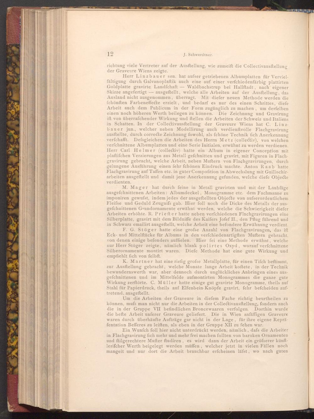 ift von überraschender Wirkung und ftellen die Arbeiten der Schweiz und Italiens in Schatten. In der Collectivausftellung der Graveure Wiens hat C. Linzbauer jun., welcher neben Modellirung auch verdienftvolle Flachgravirung ausftellte, durch correcte Zeichnung fowohl, als fchöne Technik fich Anerkennung verfchafft. Defsgleichen die Arbeiten des Herrn Metz( collectiv), von welchen verfchnittene Albumplatten und eine Serie Initialen, erwähnt zu werden verdienen. Herr Carl Helmer( collectiv) hatte ein Album in eigener Conception mit plaftifchen Verzierungen aus Metall gefchnitten und gravirt, mit Figuren in Flachgravirung gebracht, welche Arbeit, neben Muftern von Flachgravirungen, durch gelungene Ausführung einen fehr fchönen Eindruck machte. Anton Raab hatte Flachgravirung auf Taffen etc. in guter Compofition in Abwechslung mit Guillochirarbeiten ausgeftellt und damit jene Anerkennung gefunden, welche diefe Objecte
