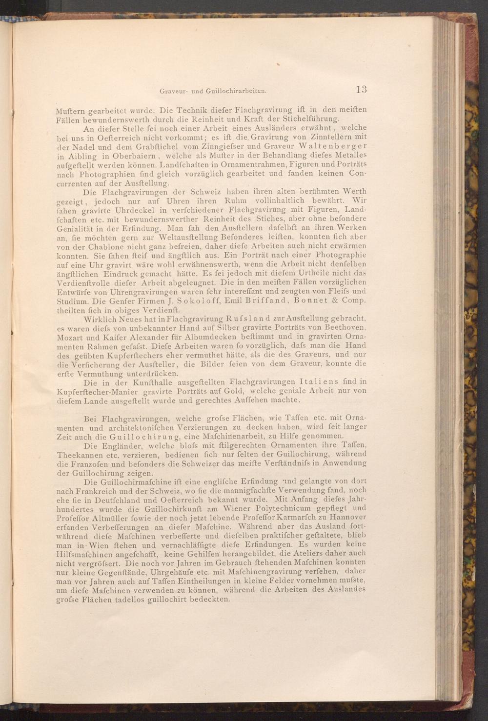 Die Guillochirmafchine ift eine englifche Erfindung und gelangte von dort nach Frankreich und der Schweiz, wo fie die mannigfachfte Verwendung fand, noch ehe fie in Deutfchland und Oefterreich bekannt wurde. Mit Anfang diefes Jahrhundertes wurde die Guillochirkunft am Wiener Polytechnicum gepflegt und Profeffor Altmüller fowie der noch jetzt lebende Profeffor Karmarfch zu Hannover erfanden Verbefferungen an diefer Mafchine. Während aber das Ausland fortwährend diefe Mafchinen verbefferte und diefelben praktifcher geftaltete, blieb man in Wien ftehen und vernachläffigte diefe Erfindungen. Es wurden keine Hilfsmafchinen angefchafft, keine Gehilfen herangebildet, die Ateliers daher auch nicht vergrössert. Die noch vor Jahren im Gebrauch ftehenden Mafchinen konnten nur kleine Gegenftände, Uhrgehäuſe etc. mit Mafchinengravirung verfehen, daher man vor Jahren auch auf Taffen Eintheilungen in kleine Felder vornehmen musste, um diefe Mafchinen verwenden zu können, während die Arbeiten des Auslandes grofse Flächen tadellos guillochirt bedeckten.