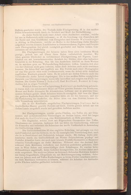 Die Flachgravirungen der Schweiz haben ihren alten berühmten Werth gezeigt, jedoch nur auf Uhren ihren Ruhm vollinhaltlich bewährt. Wir fahen gravirte Uhrdeckel in verfchiedener Flachgravirung mit Figuren, Landfchaften etc. mit bewundernswerther Reinheit des Stiches, aber ohne befondere Genialität in der Erfindung. Man fah den Ausftellern dafelbft an ihren Werken an, fie möchten gern zur Weltausftellung Befonderes leiften, konnten fich aber von der Chablone nicht ganz befreien, daher diefe Arbeiten auch nicht erwärmen konnten. Sie fahen fteif und ängftlich aus. Ein Porträt nach einer Photographie auf eine Uhr gravirt wäre wohl erwähnenswerth, wenn die Arbeit nicht denfelben ängftlichen Eindruck gemacht hätte. Es fei jedoch mit diefem Urtheile nicht das Verdienftvolle diefer Arbeit abgeleugnet. Die in den meiſten Fällen vorzüglichen Entwürfe von Uhrengravirungen waren fehr intereffant und zeugten von Fleifs und Studium. Die Genfer Firmen J. Sokoloff, Emil Briffand, Bonnet& Comp. theilten fich in obiges Verdienft.