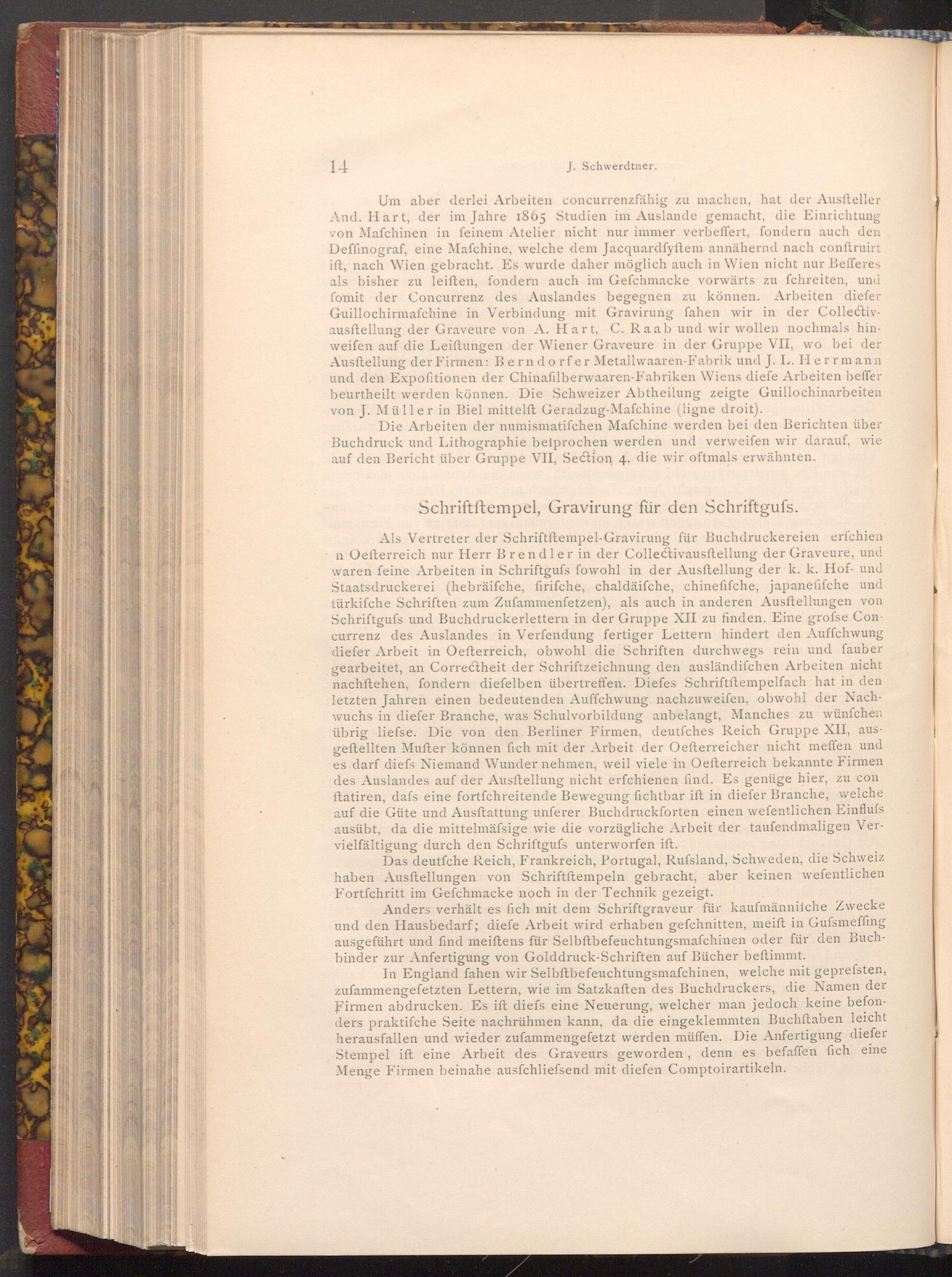 Als Vertreter der Schriftftempel- Gravirung für Buchdruckereien erfchien n Oefterreich nur Herr Brendler in der Collectivausftellung der Graveure, und waren feine Arbeiten in Schriftgufs fowohl in der Ausftellung der k. k. Hof- und Staatsdruckerei( hebräifche, firifche, chaldäifche, chinefifche, japanefifche und türkifche Schriften zum Zufammenfetzen), als auch in anderen Ausftellungen von Schriftgufs und Buchdruckerlettern in der Gruppe XII zu finden. Eine grofse Concurrenz des Auslandes in Verfendung fertiger Lettern hindert den Auffchwung diefer Arbeit in Oefterreich, obwohl die Schriften durchwegs rein und fauber gearbeitet, an Correctheit der Schriftzeichnung den ausländifchen Arbeiten nicht nachftehen, fondern diefelben übertreffen. Diefes Schriftftempelfach hat in den letzten Jahren einen bedeutenden Auffchwung nachzuweifen, obwohl der Nachwuchs in diefer Branche, was Schulvorbildung anbelangt, Manches zu wünſchen übrig liefse. Die von den Berliner Firmen, deutfches Reich Gruppe XII, ausgeftellten Mufter können fich mit der Arbeit der Oefterreicher nicht meffen und es darf diefs Niemand Wunder nehmen, weil viele in Oefterreich bekannte Firmen des Auslandes auf der Ausftellung nicht erfchienen find. Es genüge hier, zu con ftatiren, dafs eine fortfchreitende Bewegung fichtbar ift in diefer Branche, welche auf die Güte und Ausftattung unferer Buchdruckforten einen wefentlichen Einfluís ausübt, da die mittelmäfsige wie die vorzügliche Arbeit der taufendmaligen Vervielfältigung durch den Schriftgufs unterworfen ift.