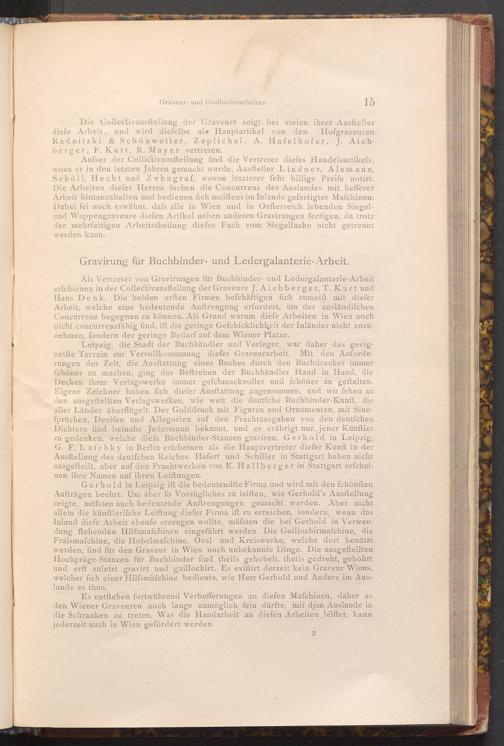 Als Vertreter von Gravirungen für Buchbinder- und Ledergalanterie- Arbeit erfchienen in der Collectivausflellung der Graveure J. Aichberger, T. Kurt und Hans Denk. Die beiden erften Firmen befchäftigen fich zumeift mit diefer Arbeit, welche eine bedeutende Anftrengung erfordert, um der ausländifchen Concurrenz begegnen zu können. Als Grund warum diefe Arbeiten in Wien noch nicht concurrenzfähig find, ift die geringe Gefchicklichkeit der Inländer nicht anzunehmen, fondern der geringe Bedarf auf dem Wiener Platze.