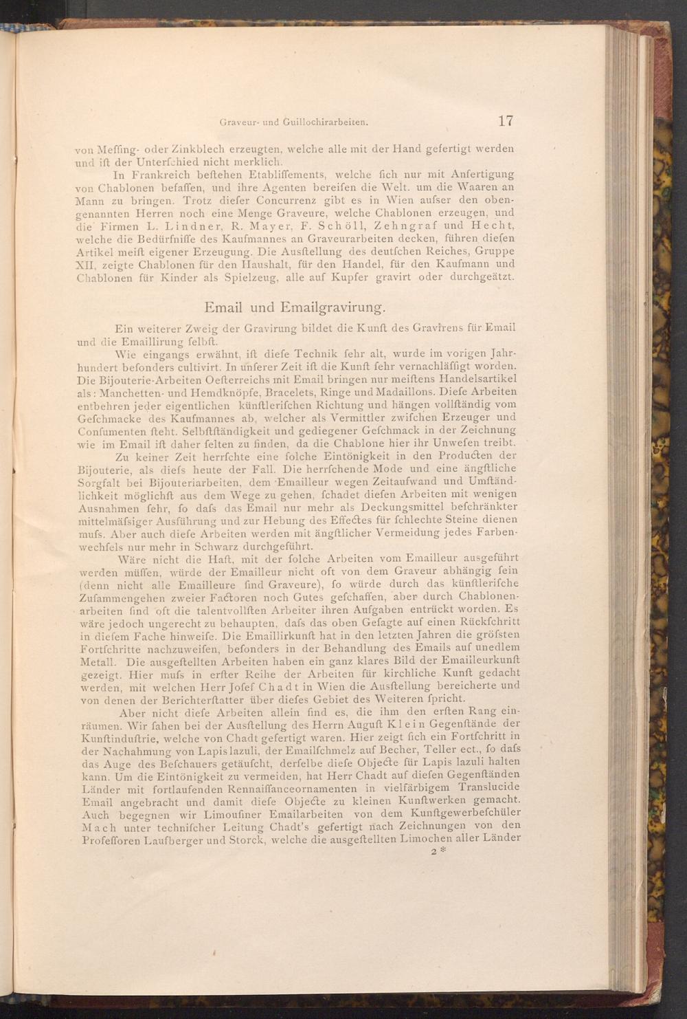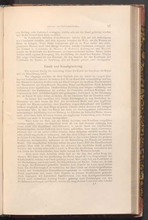 Aber nicht diefe Arbeiten allein find es, die ihm den erften Rang einräumen. Wir fahen bei der Ausstellung des Herrn Auguft Klein Gegenftände der Kunftinduftrie, welche von Chadt gefertigt waren. Hier zeigt fich ein Fortfchritt in der Nachahmung von Lapis lazuli, der Emailfchmelz auf Becher, Teller ect., fo dafs das Auge des Befchauers getäufcht, derfelbe diefe Objecte für Lapis lazuli halten kann. Um die Eintönigkeit zu vermeiden, hat Herr Chadt auf diefen Gegenständen Länder mit fortlaufenden Rennaiffance ornamenten in vielfärbigem Translucide Email angebracht und damit diefe Objecte zu kleinen Kunftwerken gemacht. Auch begegnen wir Limoufiner Emailarbeiten von dem Kunstgewerbefchüler Mach unter technifcher Leitung Chadt's gefertigt nach Zeichnungen von den Profefforen Laufberger und Storck, welche die ausgeftellten Limochen aller Länder