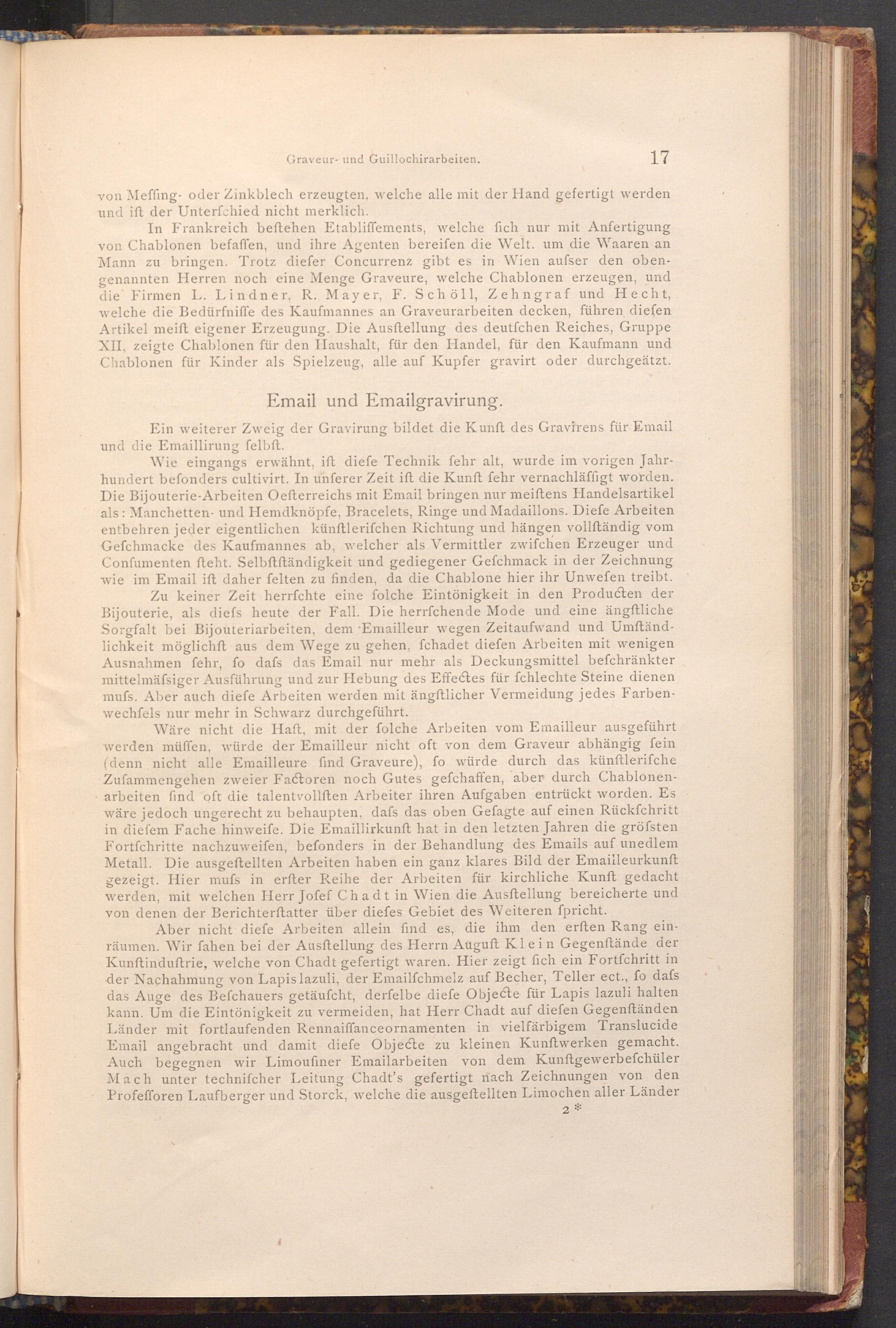 Wie eingangs erwähnt, ift diefe Technik fehr alt, wurde im vorigen Jahrhundert befonders cultivirt. In unferer Zeit ift die Kunft fehr vernachläffigt worden. Die Bijouterie- Arbeiten Oefterreichs mit Email bringen nur meiftens Handelsartikel als: Manchetten- und Hemdknöpfe, Bracelets, Ringe und Madaillons. Diefe Arbeiten entbehren jeder eigentlichen künftlerifchen Richtung und hängen vollſtändig vom Gefchmacke des Kaufmannes ab, welcher als Vermittler zwifchen Erzeuger und Confumenten fteht. Selbftftändigkeit und gediegener Gefchmack in der Zeichnung wie im Email ift daher felten zu finden, da die Chablone hier ihr Unwefen treibt. Zu keiner Zeit herrfchte eine folche Eintönigkeit in den Producten der Bijouterie, als diefs heute der Fall. Die herrfchende Mode und eine ängftliche Sorgfalt bei Bijouteriarbeiten, dem Emailleur wegen Zeitaufwand und Umftändlichkeit möglichft aus dem Wege zu gehen, fchadet diefen Arbeiten mit wenigen Ausnahmen fehr, fo dafs das Email nur mehr als Deckungsmittel befchränkter mittelmäfsiger Ausführung und zur Hebung des Effectes für fchlechte Steine dienen mufs. Aber auch diefe Arbeiten werden mit ängftlicher Vermeidung jedes Farbenwechfels nur mehr in Schwarz durchgeführt.