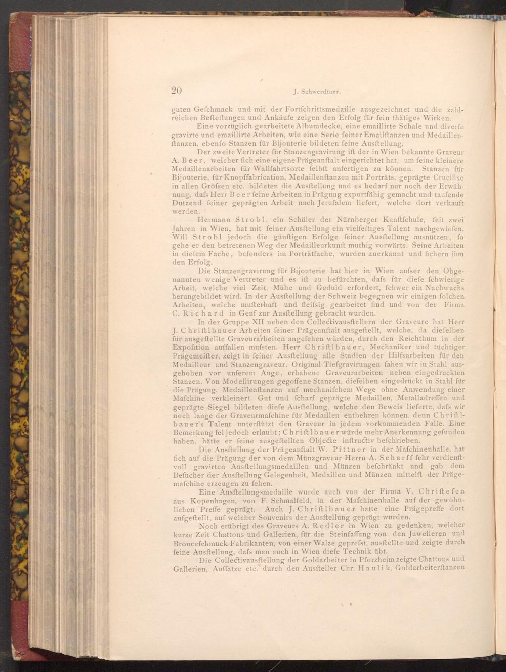 Eine Ausstellungsmedaille wurde auch von der Firma V. Chriftefen aus Kopenhagen, von F. Schmalfeld, in der Mafchinenhalle auf der gewöhnlichen Preffe geprägt. Auch J. Chriftlbauer hatte eine Prägepreffe dort aufgeftellt, auf welcher Souvenirs der Ausftellung geprägt wurden.