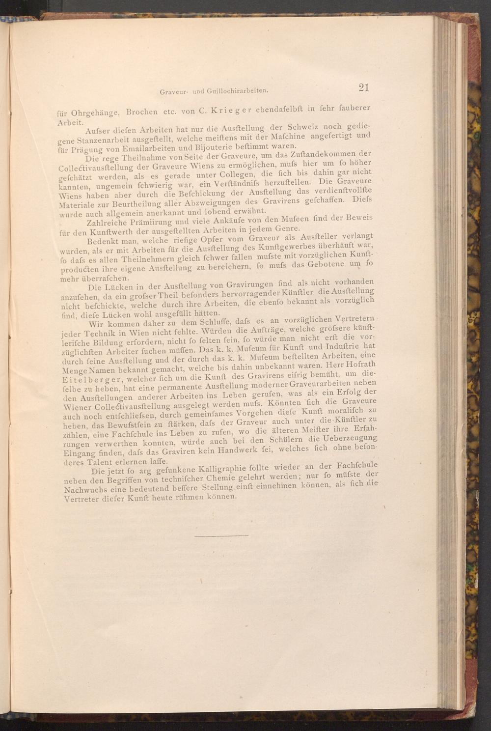 Wir kommen daher zu dem Schluffe, dafs es an vorzüglichen Vertretern jeder Technik in Wien nicht fehlte. Würden die Aufträge, welche gröfsere künftlerifche Bildung erfordern, nicht fo felten fein, fo würde man nicht erft die vorzüglichften Arbeiter fuchen müffen. Das k. k. Mufeum für Kunft und Induſtrie hat durch feine Ausftellung und der durch das k. k. Muſeum beftellten Arbeiten, eine Menge Namen bekannt gemacht, welche bis dahin unbekannt waren. Herr Hofrath Eitelberger, welcher fich um die Kunft des Gravirens eifrig bemüht, um diefelbe zu heben, hat eine permanente Ausstellung moderner Graveurarbeiten neben den Ausftellungen anderer Arbeiten ins Leben gerufen, was als ein Erfolg der Wiener Collectivausftellung ausgelegt werden mufs. Könnten fich die Graveure auch noch entfchliefsen, durch gemeinfames Vorgehen diefe Kunft moralifch zu heben, das Bewufstfein zu ftärken, dafs der Graveur auch unter die Künftler zu zählen, eine Fachfchule ins Leben zu rufen, wo die älteren Meifter ihre Erfahrungen verwerthen konnten, würde auch bei den Schülern die Ueberzeugung Eingang finden, dafs das Graviren kein Handwerk fei, welches fich ohne befonderes Talent erlernen laffe.