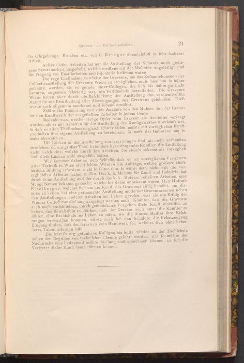 Die rege Theilnahme von Seite der Graveure, um das Zuftandekommen der Collectivausftellung der Graveure Wiens zu ermöglichen, mufs hier um fo höher gefchätzt werden, als es gerade unter Collegen, die fich bis dahin gar nicht kannten, ungemein fchwierig war, ein Verftändnifs herzuftellen. Die Graveure Wiens haben aber durch die Befchickung der Ausftellung das verdienftvollfte Materiale zur Beurtheilung aller Abzweigungen des Gravirens gefchaffen. Diefs wurde auch allgemein anerkannt und lobend erwähnt.