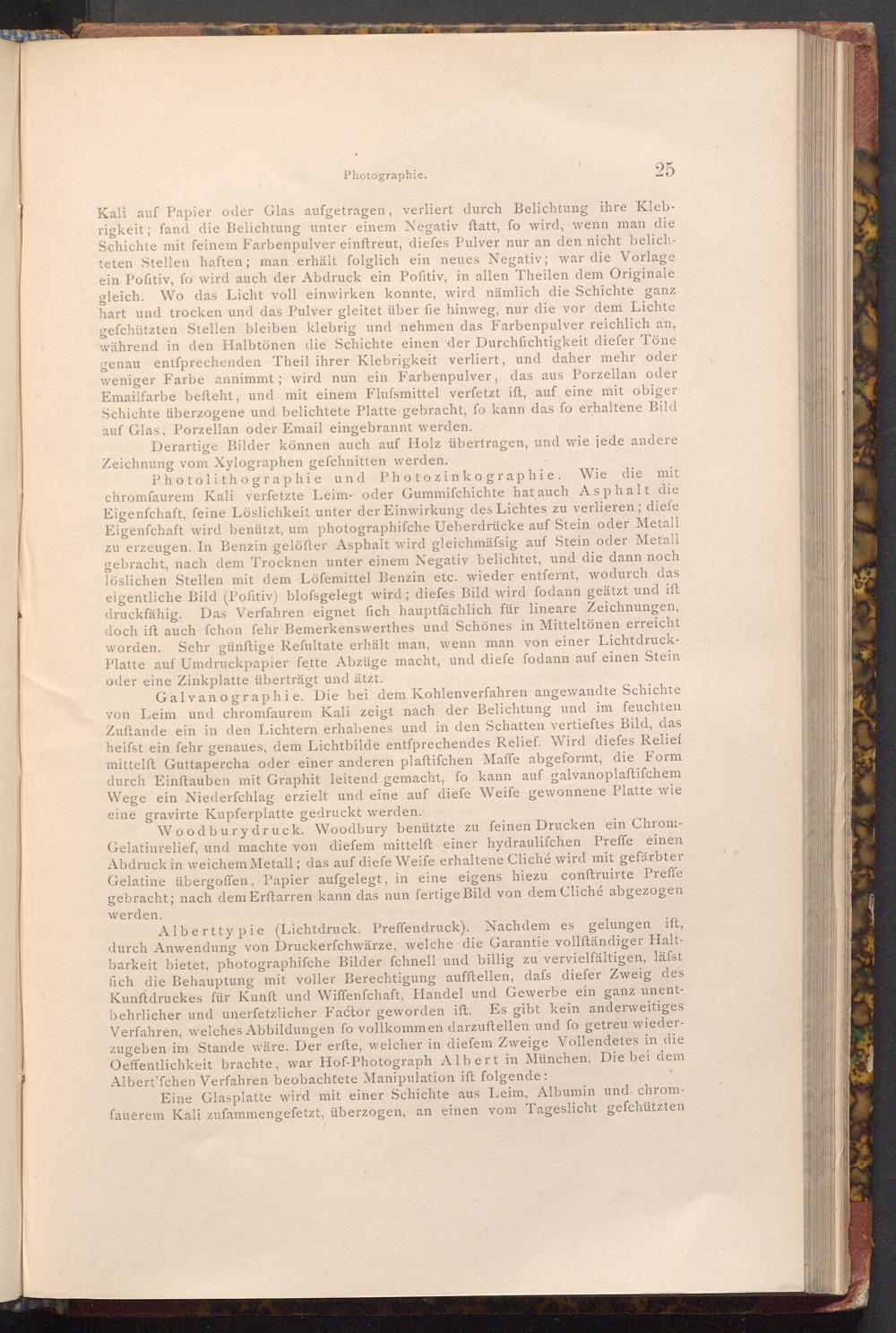 Woodburydruck. Woodbury benützte zu feinen Drucken ein ChromGelatinrelief, und machte von diefem mittelft einer hydraulifchen Preffe einen Abdruck in weichem Metall; das auf diefe Weife erhaltene Cliché wird mit gefärbter Gelatine übergoffen, Papier aufgelegt, in eine eigens hiezu conftruirte Preffe gebracht; nach dem Erftarren kann das nun fertige Bild von dem Cliché abgezogen werden.