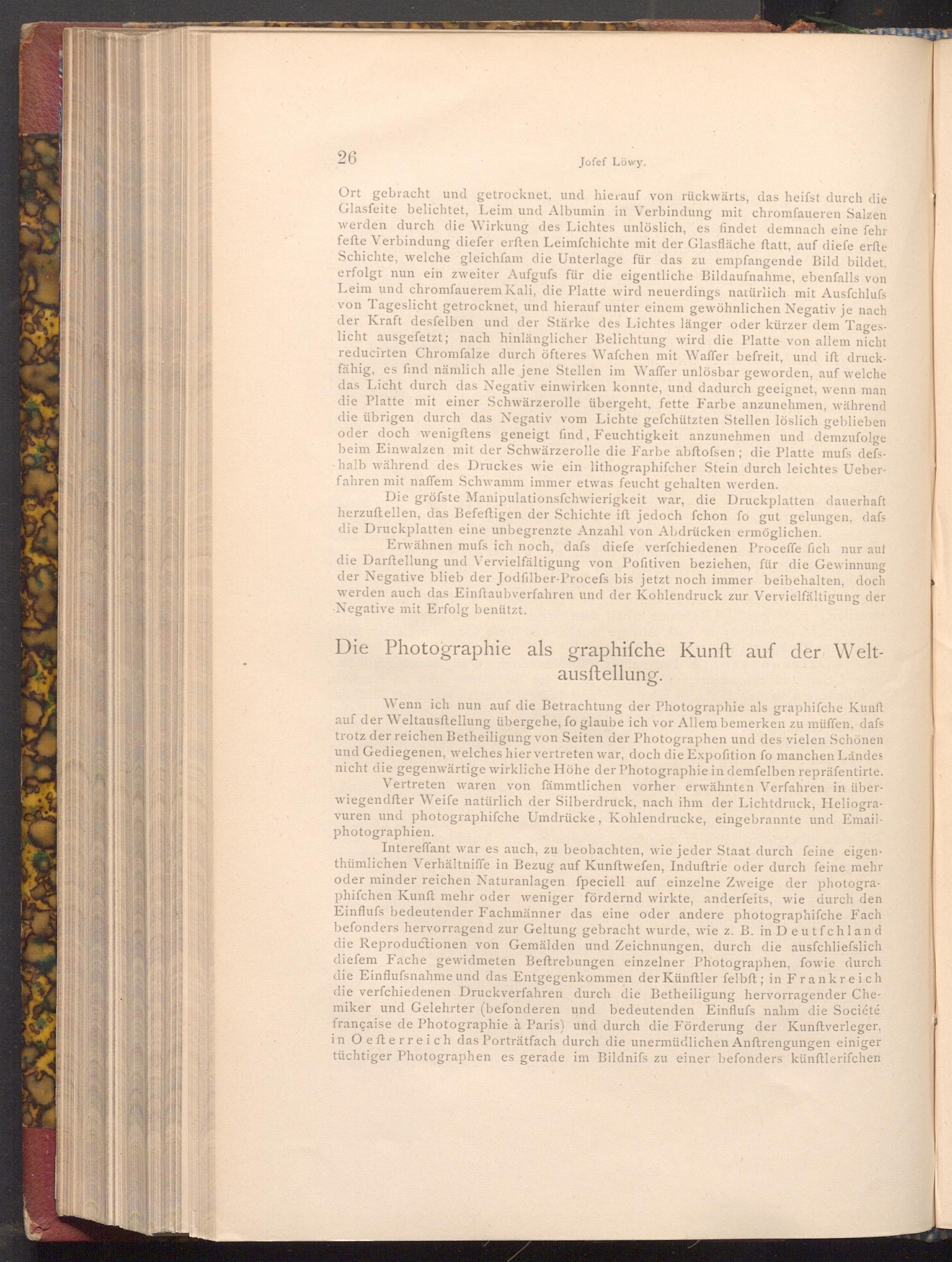 Wenn ich nun auf die Betrachtung der Photographie als graphifche Kunft auf der Weltausftellung übergehe, fo glaube ich vor Allem bemerken zu müffen, dafs trotz der reichen Betheiligung von Seiten der Photographen und des vielen Schönen und Gediegenen, welches hier vertreten war, doch die Expofition fo manchen Landes nicht die gegenwärtige wirkliche Höhe der Photographie in demfelben repräfentirte. Vertreten waren von fämmtlichen vorher erwähnten Verfahren in überwiegendfter Weife natürlich der Silberdruck, nach ihm der Lichtdruck, Heliogravuren und photographifche Umdrücke, Kohlendrucke, eingebrannte und Emailphotographien.