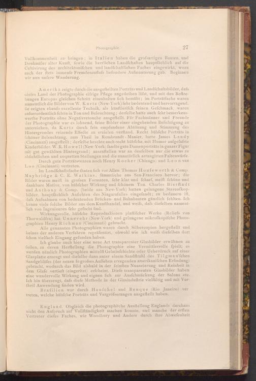 Amerika zeigte durch die ausgeftellten Porträts und Landfchaftsbilder, dafs aiefes Land der Photographie eifrige Pflege angedeihen läfst, und mit den Beftrebungen Europas gleichen Schritt einzuhalten fich bemüht; im Porträtfache waren namentlich die Bilder von W. Kurtz( New- York) fehr bedeutend und hervorragend, fie zeigten ebenfo excellente Technik, als künftlerifch feinen Gefchmack, waren aufserordentlich fchön in Ton und Beleuchtung; derfelbe hatte auch fehr bemerkenswerthe Porträts ohne Negativretouche ausgeftellt. Für Fachmänner und Freunde der Photographie war es lohnend, feine Bilder einer eingehenden Befichtigung zu unterziehen, da Kurtz durch fein empfundene Abtönung und Stimmung des Hintergrundes reizende Effecte zu erzielen verftand. Recht hübfche Porträts in fchöner Beleuchtung, zum Theil in Rembrandt Manier, hatte James Landy ( Cincinnati) ausgeftellt; derfelbe brachte auch recht hübfche, mit Humor aufgefafste Kinderbilder. W. R. Howell( New- York) fandte gute Damenporträts in ganzer Figur mit gut gewählten Hintergrund; auszuftellen war an denfelben nur die etwas zu abfichtlichen und coquetten Stellungen und die unnatürlich arrangirten Faltenwürfe. Durch gute Porträts waren noch Henry Rocher( Chicago) und Leon van Loo( Cincinnati) vertreten.